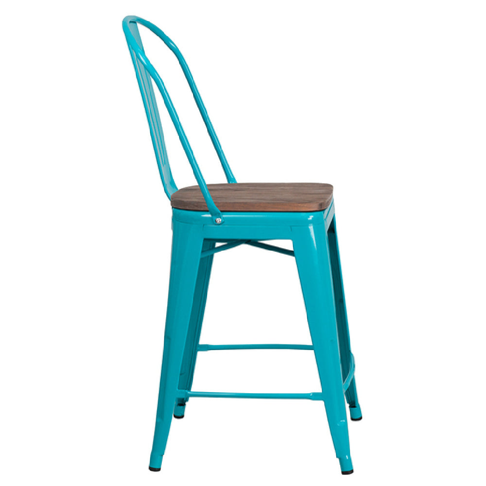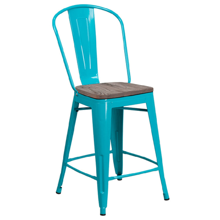 The Flash Furniture ET-3534-24-CB-WD-GG Bar Stool is a high-capacity seating solution with a weight limit of 500 lb, making it suitable for various commercial and residential settings requiring durable and robust furniture. Designed for counter-height applications, it features a curved back with a vertical slat that combines ergonomic support with a stylish aesthetic. The stool is equipped with a textured wood seat, offering a rustic appeal while ensuring comfort. A cross brace under the seat provides additional stability and support. Constructed from galvanized steel, this stool is finished with a distressed powder coat, enhancing its durability and resistance to wear. The presence of a footrest adds to the user's comfort, while rubber floor glides protect flooring surfaces from scratches. Lightweight in nature, this stool is easily movable and is presented in a vibrant teal blue color. With most in-stock items shipping within 24 hours, it is a practical choice for those needing reliable and quick furnishing solutions. The Flash Furniture ET-3534-24-CB-WD-GG Bar Stool stands out for its combination of strength, style, and functionality, catering to diverse industry markets ranging from hospitality to home use.