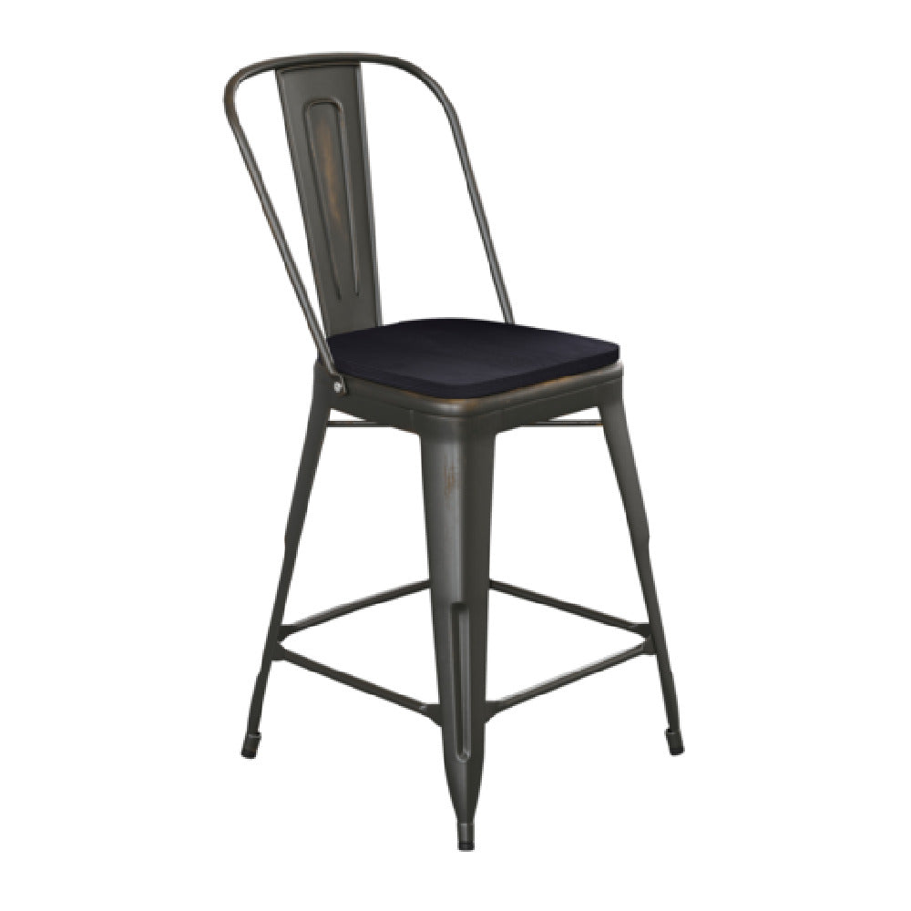 Flash Furniture ET-3534-24-COP-PL1B-GG Carly Bar Stool 500 Lb. Weight Capacity is a versatile seating solution designed for both indoor and outdoor environments. With a substantial weight capacity of 500 lb., this stool caters to a wide demographic, ensuring durability and reliability across various settings including commercial spaces, residential kitchens, and outdoor patios. The stool stands at counter height, making it an ideal fit for standard countertops and bars. It features a curved back with a vertical slat, offering ergonomic support and a modern aesthetic. The seat is crafted from black poly resin, enhancing comfort and ease of maintenance. A cross brace under the seat adds extra stability, while the distressed steel frame provides a rustic yet contemporary look. This stool is equipped with a footrest for added comfort and floor glides to protect surfaces from scratches. Available in a striking copper finish, it requires assembly upon delivery. Its robust construction and stylish design make the Flash Furniture Carly Bar Stool a valuable addition to any space looking to balance functionality with design appeal.