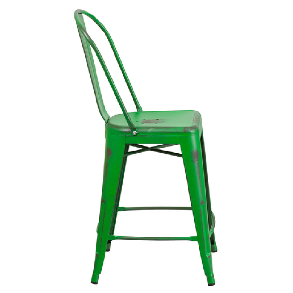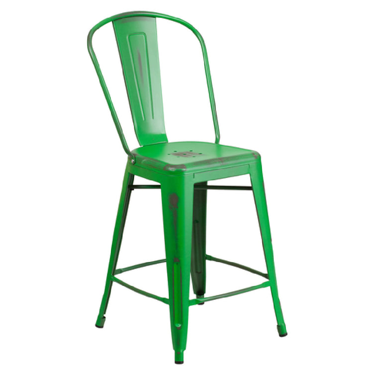 The Flash Furniture ET-3534-24-GN-GG Bar Stool is a robust seating solution with a remarkable 500 lb. weight capacity, making it suitable for both commercial and residential use. This counter height stool features a curved back with a vertical slat design, ensuring user comfort and support. Engineered for durability, it includes a cross brace under the seat and is constructed from galvanized steel with a distressed powder coat finish, highlighting its resilience and stylish aesthetic. The seat is designed with drain holes, promoting quick drying and maintenance, while the integrated footrest enhances user comfort. Equipped with rubber floor glides, this lightweight stool is gentle on floors and versatile for indoor and outdoor settings. Available in a vibrant green color, it adds a splash of color to any environment. Its stock items usually ship within 24 hours, ensuring prompt availability for your seating needs. This bar stool is an excellent choice for restaurants, bars, or home counters, offering a blend of strength, style, and convenience.