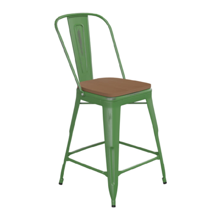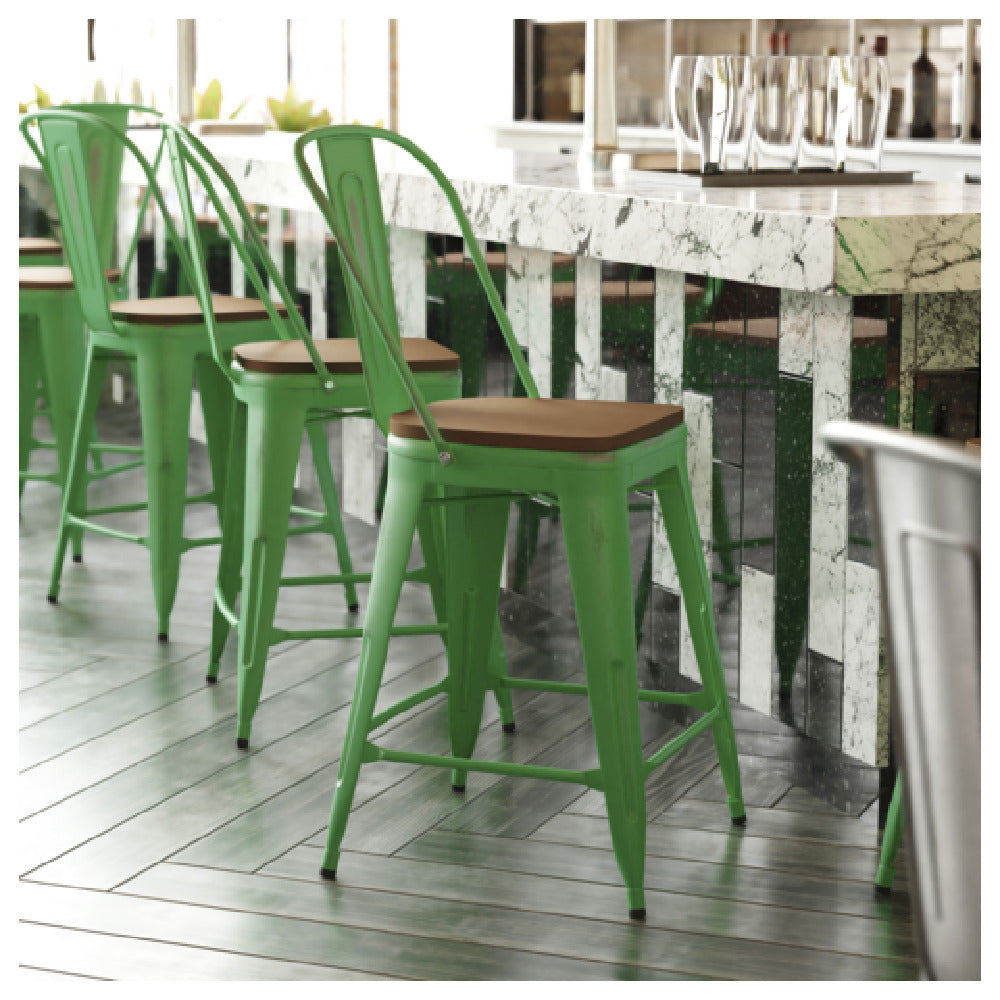 The Flash Furniture ET-3534-24-GN-PL1T-GG Carly Counter Height Stool 24" High Metal Back & Frame is a versatile seating solution, meticulously crafted to meet the demands of both commercial and residential settings. Standing at a height of 24 inches, this stool is designed with a sturdy metal back and frame, ensuring durability and stability, making it a reliable choice for high-traffic areas like cafés, restaurants, and kitchen counters. The stool features a teak poly resin wood seat, which combines the aesthetic appeal of natural wood with enhanced durability and low maintenance, ideal for outdoor and indoor use. The vibrant green finish of the frame adds a pop of color, making it a stylish addition to modern and contemporary designs. This stool's robust construction supports varied applications, serving the hospitality industry, home renovations, and event planning businesses. Its compact design allows for easy arrangement and storage, optimizing space in busy environments. The Flash Furniture Carly Counter Height Stool demonstrates a harmonious blend of functionality and style, providing ergonomic seating while complementing diverse décor themes, making it a smart investment for those seeking quality and design efficiency.