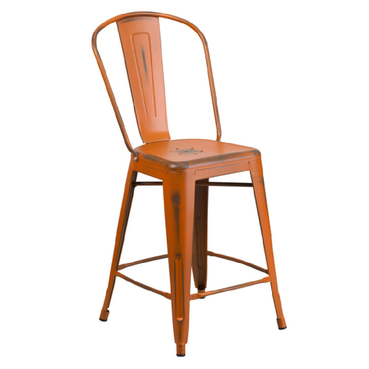 The Flash Furniture ET-3534-24-OR-GG Bar Stool is a dynamic seating solution with a remarkable weight capacity of 500 lb, making it suitable for a wide range of users. Engineered for counter height seating, this bar stool features a curved back with a vertical slat, providing both style and ergonomic support. The seat is designed with drain holes, enhancing its practicality for both indoor and outdoor settings. A robust cross brace under the seat ensures stability, while the galvanized steel construction and distressed powder coat finish offer durability and a rustic aesthetic. This lightweight stool includes a footrest for added comfort and rubber floor glides to protect flooring surfaces. Designed to accommodate both commercial and residential use, it efficiently balances functionality and style. The vibrant orange finish adds a pop of color to any space, making it a versatile choice for various environments. With a quick shipping timeline for in-stock items, this bar stool is a practical and stylish seating option for diverse market segments, from home dining areas to bustling cafes and bars.