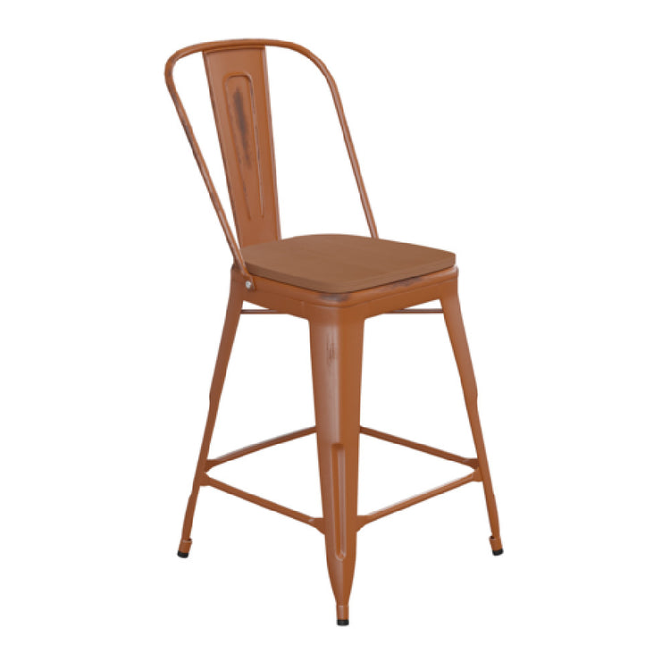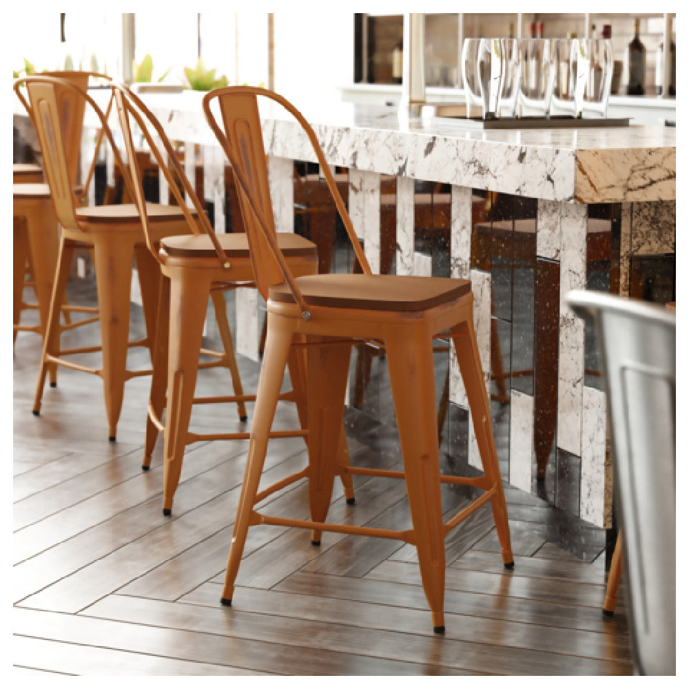 The Flash Furniture ET-3534-24-OR-PL1T-GG Carly Bar Stool is a versatile seating solution characterized by its impressive 500 lb. weight capacity, catering to a broad range of users. This counter-height stool features a distinctive curved back with a vertical slat design, providing aesthetic appeal and ergonomic support. The stool's seat is made from durable teal poly resin, which ensures long-lasting use and easy maintenance. A cross brace positioned under the seat enhances stability, while the distressed steel frame contributes to its industrial charm. Practicality is further emphasized by the inclusion of a footrest and floor glides, which protect flooring surfaces and ensure smooth movement. The design accommodates both indoor and outdoor environments, making it suitable for various settings, from commercial establishments to residential spaces. The vibrant orange finish adds a striking pop of color, while the assembly requirement allows for convenient shipping and tailored setup. This bar stool, with its robust construction and adaptable design, presents an ideal choice for those seeking reliable and stylish seating.