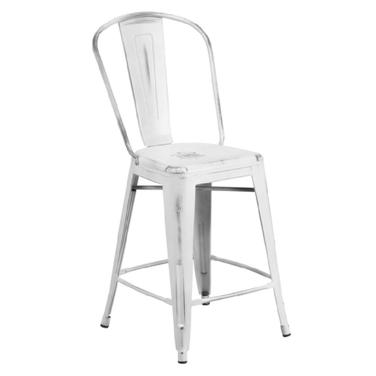 The Flash Furniture ET-3534-24-WH-GG Bar Stool is a versatile seating solution designed to accommodate a weight capacity of up to 500 lb., making it an excellent choice for a wide range of commercial and residential environments. Its counter height design is crafted to offer a comfortable seating experience, featuring a curved back with vertical slat for ergonomic support. The stool is constructed from galvanized steel, ensuring durability and resilience, while the distressed powder coat finish adds a touch of rustic charm. Practicality is further enhanced with the inclusion of drain holes in the seat, facilitating quick drying in outdoor settings. A cross brace under the seat provides additional stability, and the attached footrest offers comfort during extended use. The rubber floor glides protect flooring surfaces from scratches and scuffs, making it suitable for indoor use. Lightweight in nature, the Flash Furniture ET-3534-24-WH-GG Bar Stool is designed for easy mobility and adaptability, fitting seamlessly into both indoor and outdoor settings. Its availability in white ensures compatibility with various decor styles. Typically, in-stock items are ready for shipment within 24 hours, providing quick access to this reliable seating option.