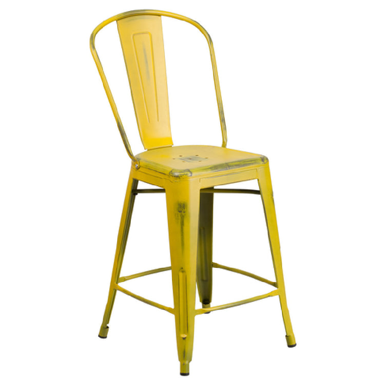 The Flash Furniture ET-3534-24-YL-GG Bar Stool is a versatile seating solution with a remarkable 500 lb. weight capacity, suitable for a variety of environments. This counter-height stool features a curved back with a vertical slat design, providing both support and a stylish appearance. It is crafted from galvanized steel and finished with a distressed powder coat, adding durability and a unique aesthetic appeal. The seat includes drain holes, which make it ideal for both indoor and outdoor settings by allowing water to pass through easily. A cross brace under the seat ensures stability, while the integrated footrest adds comfort for extended use. Equipped with rubber floor glides, this lightweight stool protects floors and enhances mobility. Designed for commercial and residential use, it effortlessly fits into diverse settings from busy cafes to stylish home kitchens. The vibrant yellow finish makes this stool a standout piece, ready to be shipped within 24 hours for in-stock items, ensuring quick delivery for immediate needs. This bar stool exemplifies a blend of functionality and design, catering to varying market segments looking for robust and visually appealing seating options.