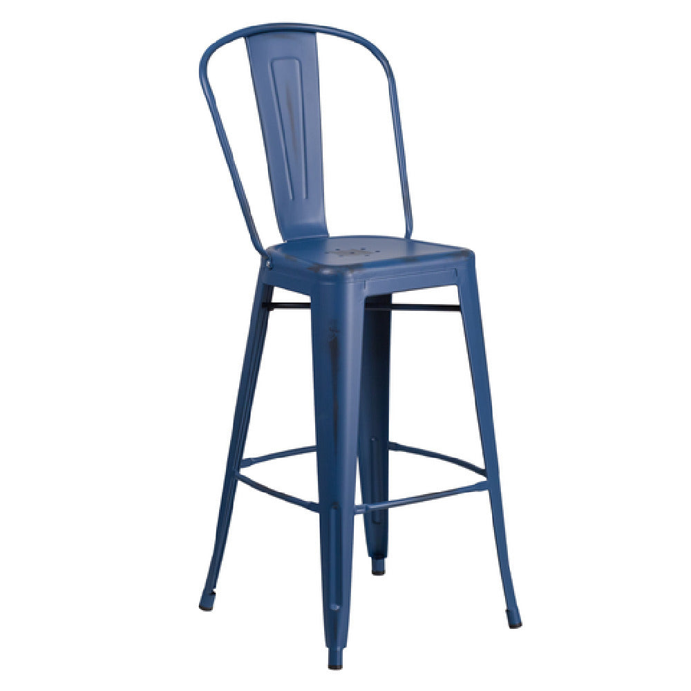 The Flash Furniture ET-3534-30-AB-GG Bar Stool is a versatile seating option with a substantial weight capacity of 500 lb, making it suitable for a wide range of users in both commercial and residential settings. This bar stool features a curved back with a vertical slat for added support and style, coupled with drain holes in the seat for easy maintenance and durability in various environments. The construction includes a cross brace under the seat, enhancing its stability, while the galvanized steel frame is finished with a distressed powder coat, offering an antique blue aesthetic that complements diverse interior or exterior décors. Equipped with a footrest for increased comfort, the bar stool also comes with rubber floor glides to protect surfaces from scratches and marks. Designed to be lightweight, this stool is easily movable, making it ideal for both indoor and outdoor use. Assembly is required, and the product is readily available with in-stock items typically shipping within 24 hours. This bar stool's combination of strength, style, and functionality makes it an excellent choice for hospitality venues, casual dining spaces, patios, and home bars, catering to different market segments with its robust design and attractive finish.