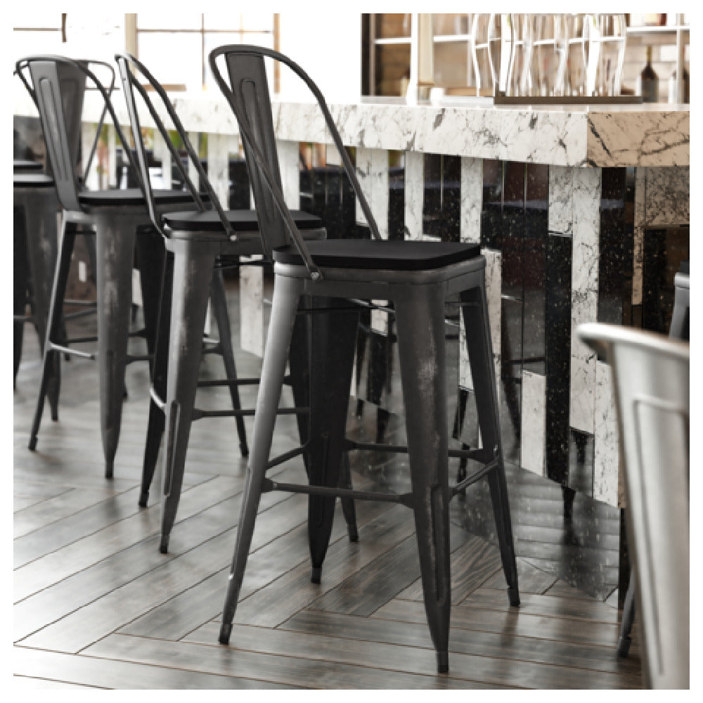 The Flash Furniture ET-3534-30-BK-PL1B-GG Carly Bar Stool is a durable seating solution that accommodates up to 500 pounds, making it suitable for diverse environments, from bustling bars to home kitchens. Highlighting its robust construction, the stool features a distressed steel frame that enhances its resilience and aesthetic appeal. The curved back with a vertical slat design not only ensures ergonomic comfort but also adds a touch of elegance to the overall design. A poly resin seat sits atop a cross brace under the seat, providing additional support and stability, making it a reliable choice for both indoor and outdoor settings. The stool is equipped with a footrest for added comfort and floor glides to protect surfaces from scratches, promoting ease of movement and repositioning. Available in black, this stool requires assembly, offering flexibility in shipping and storage. This product stands out in its segment by combining style with functionality, catering to various market needs, from residential to commercial spaces seeking durable and versatile seating options.