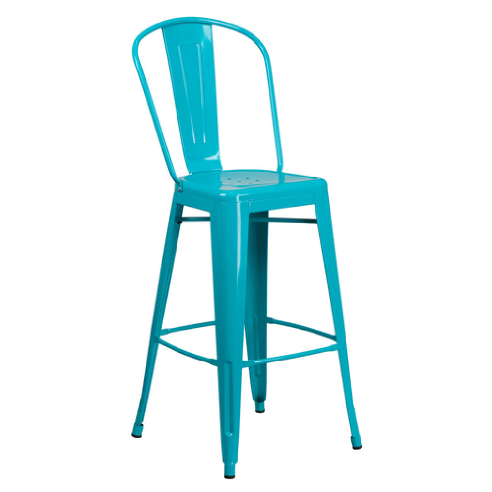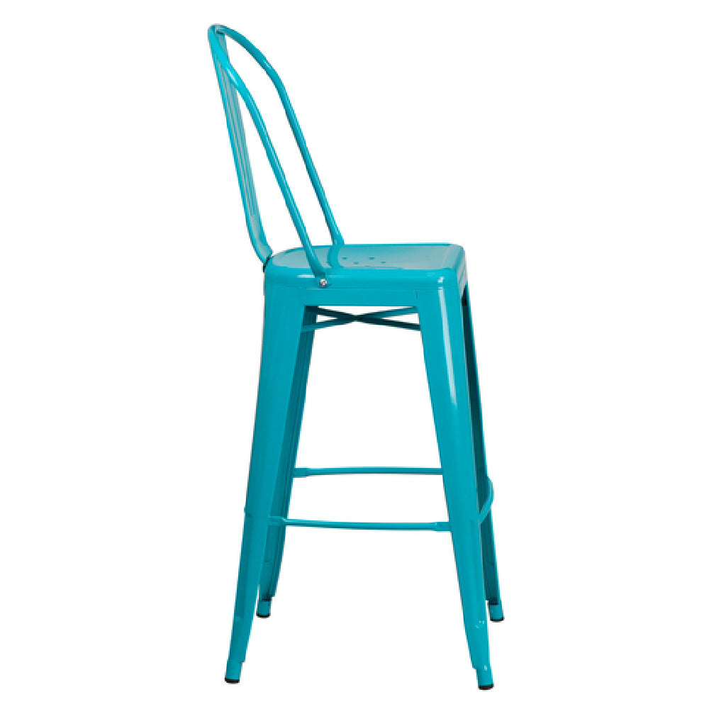 The Flash Furniture ET-3534-30-CB-GG Bar Stool is a robust seating solution designed for diverse environments with its impressive 500 lb. weight capacity. This stool features a curved back with a vertical slat, providing ergonomic support and aesthetic appeal. The seat is equipped with strategically placed drain holes, making it suitable for both indoor and outdoor use by preventing water accumulation. A cross brace beneath the seat enhances the stool's stability and strength, while the galvanized steel construction ensures durability and long-lasting performance. The powder coat finish adds an extra layer of protection against the elements. Additionally, the stool includes a footrest for added comfort and rubber floor glides to protect surfaces from scratches. Its lightweight design allows for easy maneuverability, making it ideal for commercial and residential spaces. The crystal teal/blue color adds a vibrant touch to any setting, and while assembly is required, in-stock items are typically shipped within 24 hours, ensuring quick availability. This bar stool combines functionality, style, and reliability, making it a valuable addition to any hospitality, restaurant, or home bar setting.