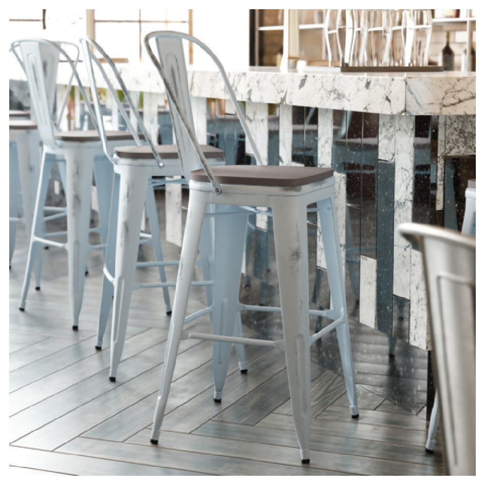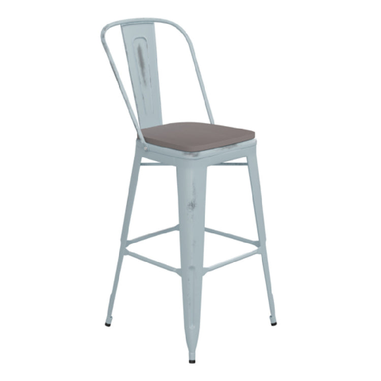The Flash Furniture ET-3534-30-DB-PL1G-GG Carly Bar Stool is a robust seating solution designed to withstand up to 500 lb. weight capacity, catering to both commercial and residential settings. This versatile stool features a curved back with a vertical slat, providing both comfort and style. The gray poly resin seat complements the distressed steel frame, creating a timeless aesthetic that fits seamlessly into various decors. Enhanced with a cross brace under the seat, this bar stool ensures additional stability and support. Its design incorporates a convenient footrest for added comfort, while floor glides protect surfaces and allow for easy movement. Suitable for both indoor and outdoor environments, this stool adapts to diverse spaces, making it an excellent choice for bars, restaurants, or patios. The appealing green-blue finish adds a touch of vibrancy to any setting. Please note that assembly is required, ensuring the user can easily set up the stool according to their specific needs. With its blend of durability, style, and functionality, the Carly Bar Stool is an exceptional seating option that meets the demands of various market segments, from hospitality to home use, providing a practical and aesthetically pleasing seating solution.