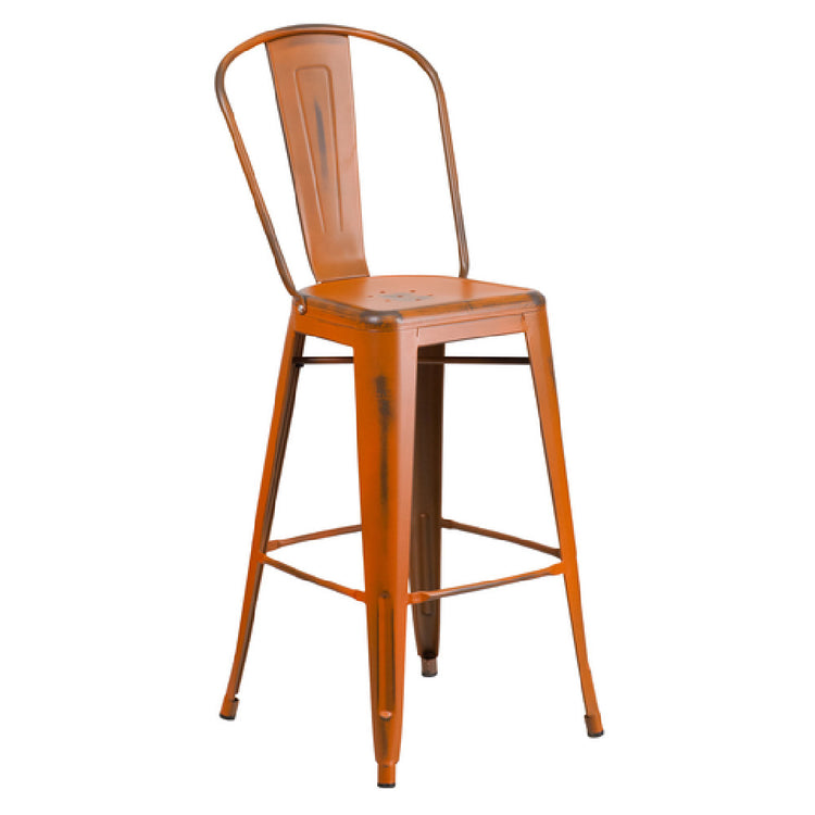 The Flash Furniture ET-3534-30-OR-GG Bar Stool is a versatile seating solution designed to accommodate a weight capacity of up to 500 lb, making it suitable for a variety of users in both commercial and residential settings. This bar stool features a curved back with a vertical slat design, offering both aesthetic appeal and ergonomic support. The seat is equipped with drain holes, enhancing durability and making it ideal for indoor and outdoor use by preventing water accumulation. Constructed with galvanized steel, the stool boasts a distressed powder coat finish in an eye-catching orange color, adding a vibrant touch to any space. The design includes a cross brace under the seat for added stability and a footrest to ensure comfort during extended use. Rubber floor glides help protect flooring surfaces from scratches. The lightweight design facilitates easy mobility, while the stool's suitability for indoor and outdoor use broadens its applicability across different environments. This product requires assembly and is available with quick shipping, as in-stock items typically ship within 24 hours. The Flash Furniture ET-3534-30-OR-GG Bar Stool effectively combines style, strength, and convenience, making it a valuable addition to any setting.