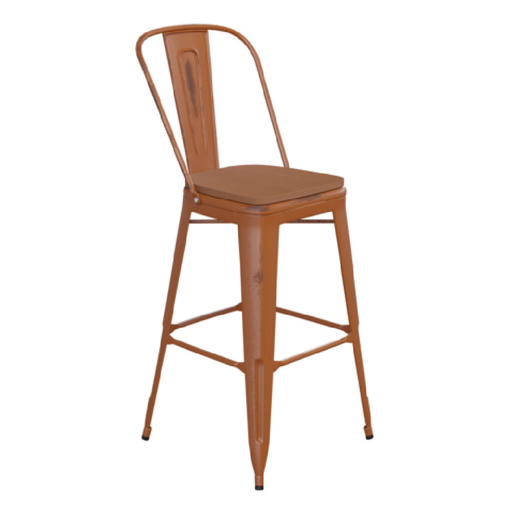 The Flash Furniture ET-3534-30-OR-PL1T-GG Carly Bar Stool is a robust seating solution with a substantial weight capacity of 500 lb. It features a curved back with a vertical slat design, providing both comfort and support for extended seating sessions. The seat is crafted from durable teak poly resin, offering both style and resilience. Stability is enhanced by a cross brace underneath the seat, making this bar stool a durable choice for various settings. The frame is constructed from distressed steel, providing an industrial yet chic aesthetic that fits seamlessly into both indoor and outdoor environments. The inclusion of a footrest adds extra comfort, making it ideal for bars, restaurants, or home use. Additionally, the stool is equipped with floor glides to protect surfaces from scratches and ensure smooth movement. Presented in a vibrant orange color, this bar stool requires assembly upon delivery, offering a versatile option for those seeking a blend of design and functionality in their seating arrangements.