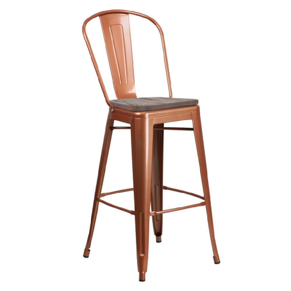 The Flash Furniture ET-3534-30-POC-WD-GG Bar Stool is a versatile seating solution distinguished by its robust construction and elegant design. With a remarkable weight capacity of 500 lbs, it is engineered to support a wide range of users, ensuring comfort and safety across diverse settings. The stool features a distinctive curved back with a vertical slat, combining aesthetic appeal with ergonomic support. Its textured wood seat offers a touch of rustic charm while providing a durable and comfortable seating surface. Reinforced with a cross brace under the seat, this stool guarantees enhanced stability, making it a reliable choice for commercial and residential environments. Crafted from galvanized steel, it boasts a distressed powder coat finish in a captivating copper tone, offering a blend of industrial durability and vintage style. The inclusion of a footrest adds to the user's comfort, while rubber floor glides protect flooring surfaces from scratches and scuffs. Despite its sturdy construction, the stool remains lightweight, facilitating easy rearrangement and mobility. This bar stool is ideal for use in restaurants, bars, or home kitchens, delivering a perfect balance of style, strength, and functionality. In-stock items typically ship within 24 hours, ensuring prompt delivery for your seating needs.