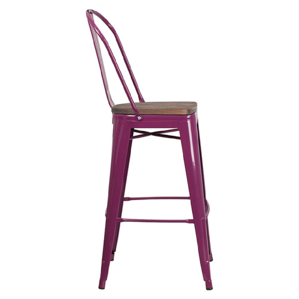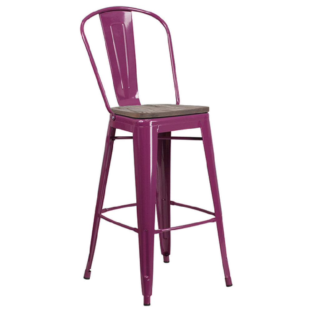The Flash Furniture ET-3534-30-PUR-WD-GG Bar Stool is a versatile seating solution designed to accommodate diverse needs with its impressive 500 lb. weight capacity. This bar stool features a distinctive curved back with a vertical slat for aesthetic appeal and ergonomic support, making it suitable for both commercial and residential settings. Its seat is crafted from textured wood, offering a rustic charm, while the galvanized steel construction ensures durability and longevity. The stool is finished with a distressed powder coat, adding an industrial touch and enhancing its resistance to wear and tear. A cross brace under the seat provides additional stability, and the integrated footrest enhances comfort for prolonged use. Lightweight yet robust, this bar stool is equipped with rubber floor glides to protect flooring surfaces and ensure smooth movement. Available in a striking purple color, the stool's in-stock items usually ship within 24 hours, catering to businesses that require prompt furniture solutions. This functional piece seamlessly blends style and practicality, making it an ideal choice for various market segments, including restaurants, bars, and home kitchens.