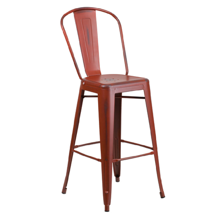 The Flash Furniture ET-3534-30-RD-GG Bar Stool is a versatile seating solution with a robust weight capacity of 500 pounds, making it suitable for both commercial and residential use. This stool features a curved back with a vertical slat design, providing ergonomic support for extended seating periods. The seat includes practical drain holes, enhancing its functionality in outdoor environments by preventing water accumulation. A cross brace under the seat ensures enhanced stability and support, while the distressed powder coat finish on galvanized steel offers durability and a stylish look. The stool is designed with a footrest for added comfort and is equipped with rubber floor glides to protect surfaces from scratches and scuffs. Lightweight construction allows for easy maneuverability, whether used indoors or outdoors. Available in a vibrant Kelly Red, this bar stool requires some assembly and ships within 24 hours for in-stock items. Its combination of aesthetic appeal, sturdy build, and practical features makes it an excellent choice for a variety of settings, from bustling cafes to stylish home bars.
