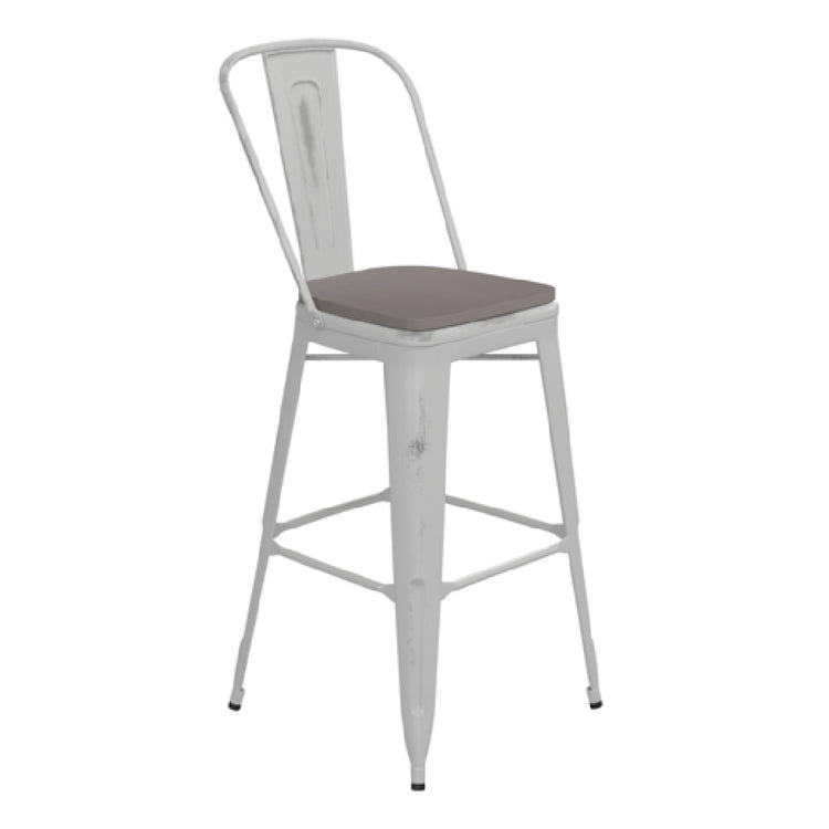 The Flash Furniture ET-3534-30-WH-PL1G-GG Carly Bar Stool is a versatile seating solution with a substantial weight capacity of 500 pounds, making it suitable for a wide range of users and settings. This bar stool features a curved back with a vertical slat design, providing ergonomic support and a touch of elegance. Its gray poly resin seat ensures comfort and durability, while the distressed steel frame adds a rustic, industrial charm. A cross brace under the seat enhances stability, making this stool a reliable choice for both residential and commercial environments. Designed for indoor and outdoor use, it is equipped with a footrest and floor glides to protect flooring surfaces. The white finish complements various decor styles, and assembly is required to ensure its robust structure. The Carly Bar Stool is ideal for bar areas, kitchens, or patios, offering a blend of style, strength, and functionality that caters to different market segments within the hospitality and home furnishing industries.