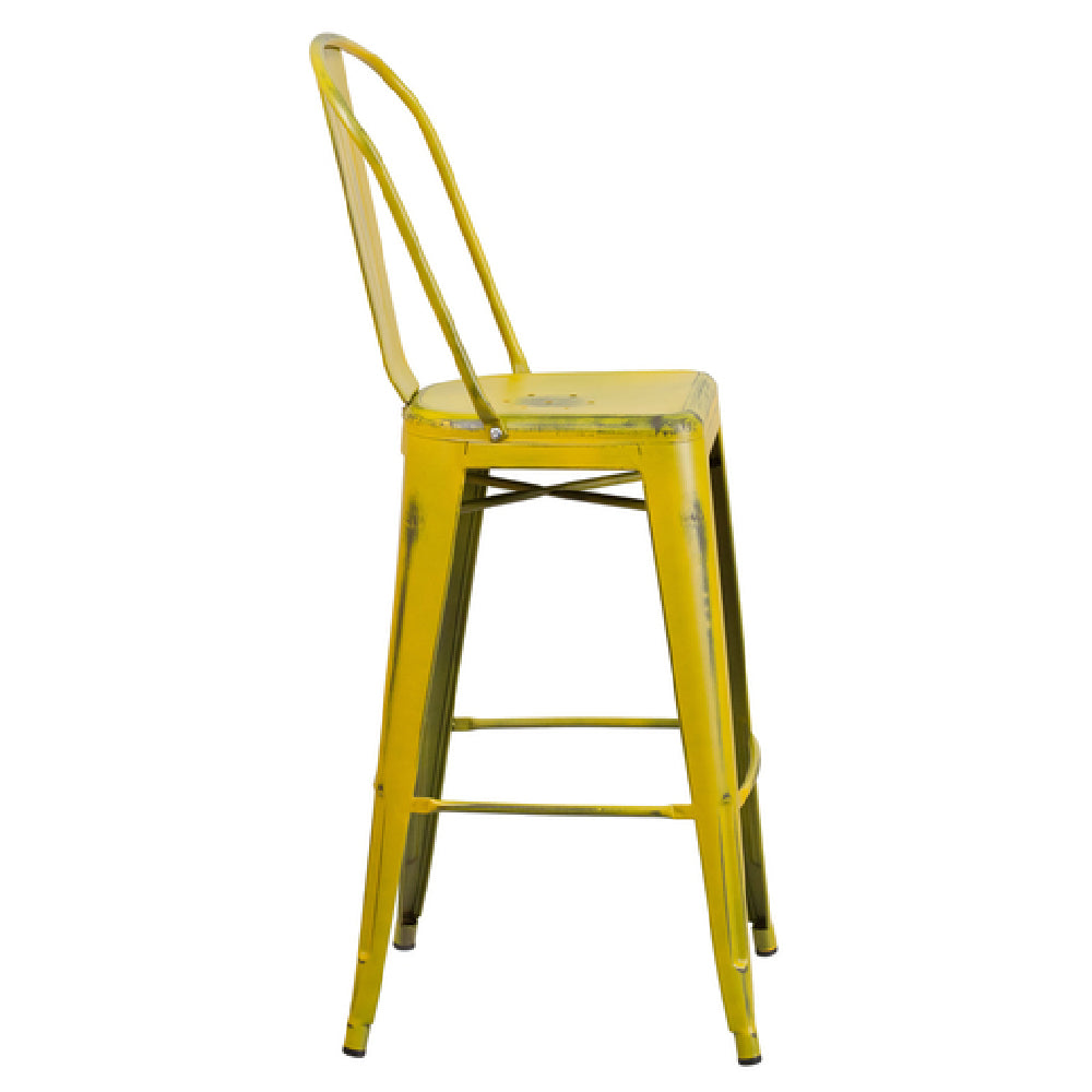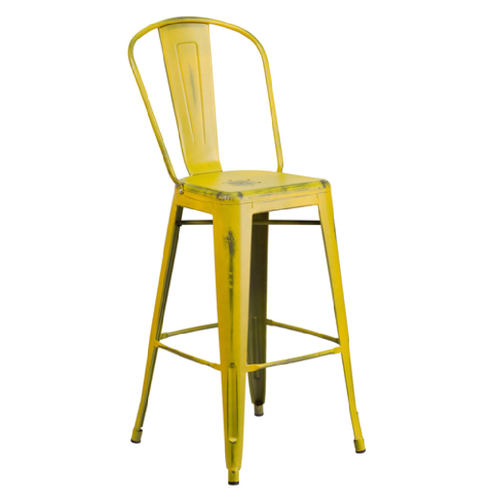 The Flash Furniture ET-3534-30-YL-GG Bar Stool is a versatile seating solution with a robust 500 lb. weight capacity, making it suitable for various commercial and residential settings. This bar stool features a curved back with a vertical slat design, providing both comfort and a stylish aesthetic. Made from durable galvanized steel, it ensures longevity, while the distressed powder coat finish in a vibrant yellow adds a touch of modern sophistication. The stool is equipped with a cross brace under the seat for added stability and drain holes in the seat, which are practical for both indoor and outdoor use. It includes a footrest for enhanced comfort and rubber floor glides to protect your flooring surfaces. The lightweight construction allows for easy repositioning, accommodating the dynamic needs of cafes, bistros, patios, and home kitchens. Assembly is required, and in-stock items usually ship within 24 hours, ensuring quick availability. This bar stool is designed to meet the demands of various market segments, providing a unique blend of durability, style, and functionality.