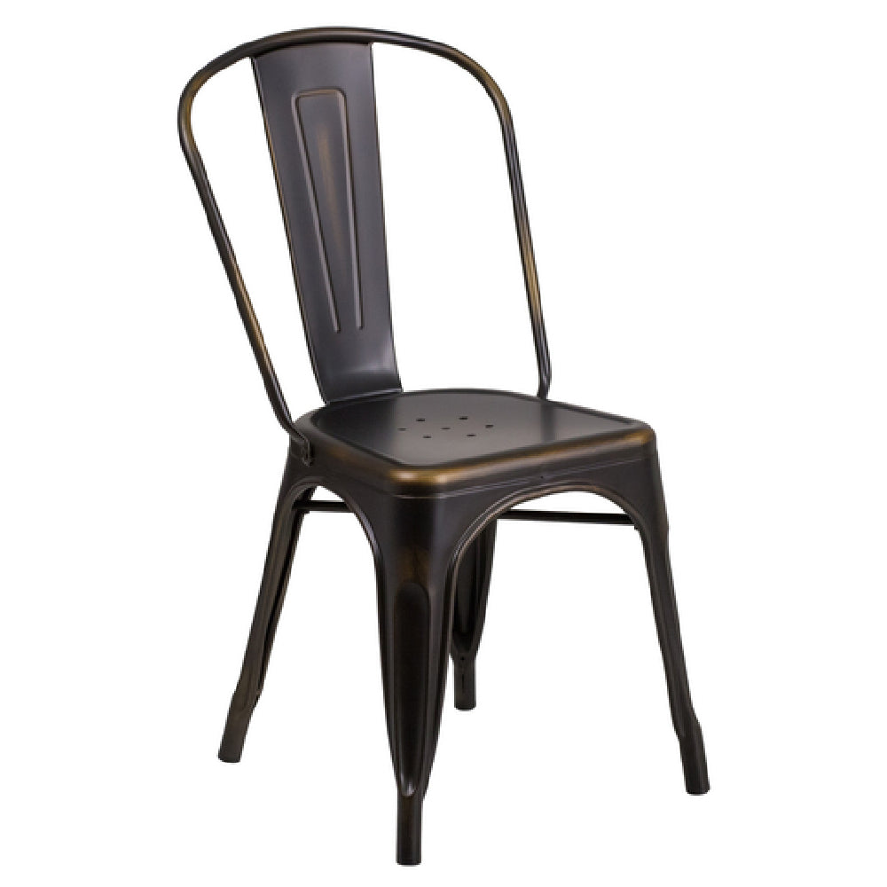 The Flash Furniture ET-3534-COP-GG Chair - 500 lb. weight capacity stackable - is a versatile seating solution designed for both commercial and residential use. This chair features a sturdy construction that supports up to 500 pounds, making it suitable for a variety of users and environments. Its curved back with a vertical slat design offers comfort and style, while the seat's drain holes ensure quick drying, making it ideal for both indoor and outdoor settings. The chair is constructed from distressed metal with a powder coat finish, providing durability and a modern aesthetic appeal. For added stability, a cross brace is positioned under the seat. Lightweight in design, the chair can be easily moved and stacked up to 8 chairs high, optimizing storage space. Rubber floor glides protect surfaces from potential damage, enhancing its practicality. Available in a striking copper finish, this chair typically ships within 24 hours from stock, ensuring prompt delivery. This product is tailored for various market segments, offering a combination of strength, style, and convenience for any seating arrangement.