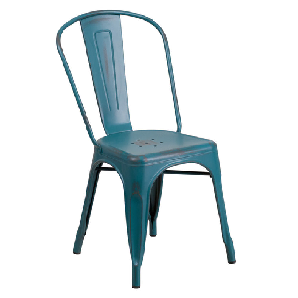 The Flash Furniture ET-3534-KB-GG Chair is a versatile seating solution with a substantial weight capacity of 500 lb, ideal for both commercial and residential environments. This stackable chair is designed to maximize space efficiency, stacking up to eight chairs high. It features a curved back with a vertical slat design, adding to its aesthetic appeal and ergonomic support. The seat is equipped with drain holes, ensuring practicality in various weather conditions for indoor and outdoor use. A cross brace under the seat enhances stability and durability, ensuring long-lasting performance. Crafted from distressed metal with a powder coat finish, it exudes a modern yet rustic charm. The chair comes with rubber floor glides to protect flooring surfaces and facilitate easy movement. Lightweight in nature, the Flash Furniture ET-3534-KB-GG Chair is easy to transport and rearrange, catering to dynamic spaces. Available in a kelly blue/teal color, it adds a vibrant touch to any setting. In-stock items typically ship within 24 hours, ensuring prompt delivery for immediate needs. This chair seamlessly integrates style, functionality, and durability, making it a valuable addition to any seating arrangement.