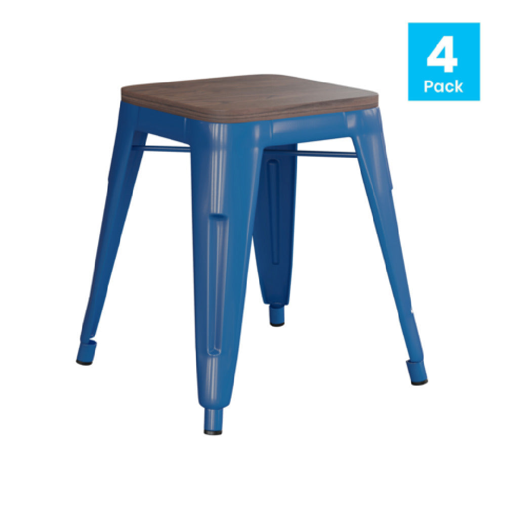 Flash Furniture ET-BT3503-18-BL-WD-GG Kai Stool is an 18-inch high seating solution designed with both form and function in mind, boasting a sturdy 250-pound weight capacity. Crafted with a square wooden seat, this stool combines natural aesthetics with modern durability, making it suitable for various environments. The welded metal construction ensures long-lasting strength and stability, while the under-seat bracing provides additional support, enhancing its overall robustness. For ease of use and convenience, the Kai Stool is stackable, allowing for efficient space management in both personal and professional settings, such as cafes, restaurants, or home dining areas. Its backless design promotes easy access and maneuverability, making it ideal for casual settings. To protect floors and reduce noise, the stool is equipped with plastic floor glides. This model comes in a striking blue finish, adding a pop of color to any space. Available in a set of four, the Kai Stool requires assembly, enabling easy transportation and setup. This versatile seating option effectively meets the diverse needs of various market segments, combining stylish design with practical features designed for everyday use.