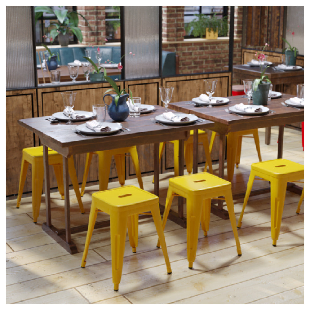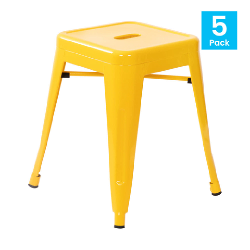 The Flash Furniture ET-BT3503-18-YL-GG Kai Stool is a practical and versatile seating solution with an 18-inch height, suitable for various commercial and residential settings. Engineered to support up to 250 pounds, this stool is designed with stackability in mind, making it an efficient choice for spaces that require flexible seating arrangements. Its backless and square design allows for unobtrusive storage and easy integration into a range of environments from casual dining to dynamic workspaces. The welded metal construction ensures durability and longevity, while under-seat bracing enhances structural integrity. For added convenience, plastic floor glides protect flooring surfaces from scratches and scuffs, making it ideal for high-traffic areas. Available in a vibrant yellow finish, the Kai Stool adds a splash of color to any setting, creating an inviting atmosphere. Sold in a set of four, this product requires assembly, offering a blend of practicality and style. Whether used in cafes, break rooms, or at home, the Flash Furniture ET-BT3503-18-YL-GG Kai Stool meets the demands of diverse market segments with its combination of sturdy build, functional design, and cheerful aesthetic.
