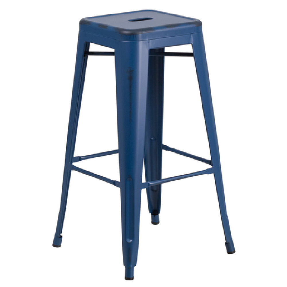 The Flash Furniture ET-BT3503-30-AB-GG Bar Stool is a versatile seating solution with a remarkable 500 lb. weight capacity, making it suitable for a wide range of users in both commercial and residential settings. Its backless design ensures a sleek and minimalist aesthetic, while the drain hole in the seat facilitates easy cleaning and maintenance, ideal for both indoor and outdoor use. The stool is constructed from galvanized steel and boasts a distressed powder coat finish, providing durability and a rustic charm. For enhanced stability, a cross brace is installed under the seat, and the inclusion of a footrest offers additional comfort. Plastic floor glides help protect flooring surfaces and contribute to the stool's lightweight nature, making it easy to move and position as needed. This bar stool is stackable up to 10 chairs high, optimizing space efficiency in storage or during transport. Available in an antique blue finish, this product is typically ready to ship within 24 hours, catering to businesses and homeowners who value prompt delivery. The Flash Furniture ET-BT3503-30-AB-GG Bar Stool is a practical and stylish choice for various market segments, including hospitality, retail, and home environments.