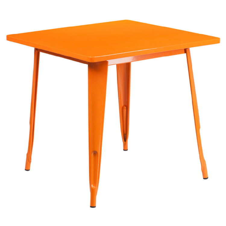 The Flash Furniture ET-CT002-1-OR-GG Table is a versatile piece, measuring 31-1/2"W x 31-1/2"D x 29-1/2"H, and is designed for both dining height comfort and aesthetic appeal. This square table features a smooth top with a 1" thick edge, providing a sleek and modern surface that complements a variety of environments. The table's robust construction is supported by a brace underneath the top, ensuring stability and durability across multiple uses. Crafted from galvanized steel with a powder coat finish, it is designed to withstand both indoor and outdoor conditions, making it suitable for commercial and residential settings alike. The vibrant orange finish adds a pop of color to any space, enhancing its visual appeal. Additionally, the table is equipped with rubber floor glides, protecting flooring surfaces and allowing for easy movement and repositioning. While assembly is required, the table's design ensures quick setup, and in-stock items typically ship within 24 hours. The Flash Furniture ET-CT002-1-OR-GG Table is a reliable choice for those seeking a functional yet stylish addition to their dining or social spaces.