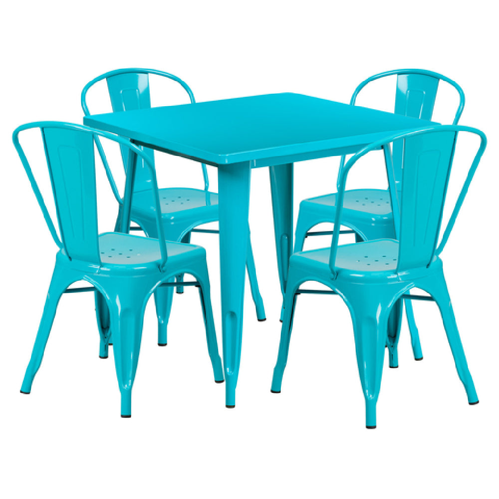 Flash Furniture ET-CT002-4-30-CB-GG Table And Chair Set is a versatile addition to both commercial and residential spaces, designed to cater to a wide range of indoor and outdoor settings. This set includes a square table measuring 31-1/2"W x 31-1/2"D x 29-1/2"H, featuring a smooth top with a 1" thick edge and a brace underneath for enhanced stability. Complementing the table are four chairs, each with dimensions of 17-3/4"W x 20"D x 33-1/2"H, showcasing a curved back with a vertical slat design. The chairs are also equipped with drain holes in the seat and a cross brace underneath for added support. Constructed from galvanized steel, the entire set is finished with a powder coat in a striking crystal teal/blue color, ensuring durability and style. Rubber floor glides protect surfaces and facilitate ease of movement. This furniture set is shipped in two boxes and typically ships within 24 hours for in-stock items. Its design not only offers functionality but also a modern aesthetic, making it an ideal choice for cafes, patios, dining rooms, and more, where versatility and style are paramount.