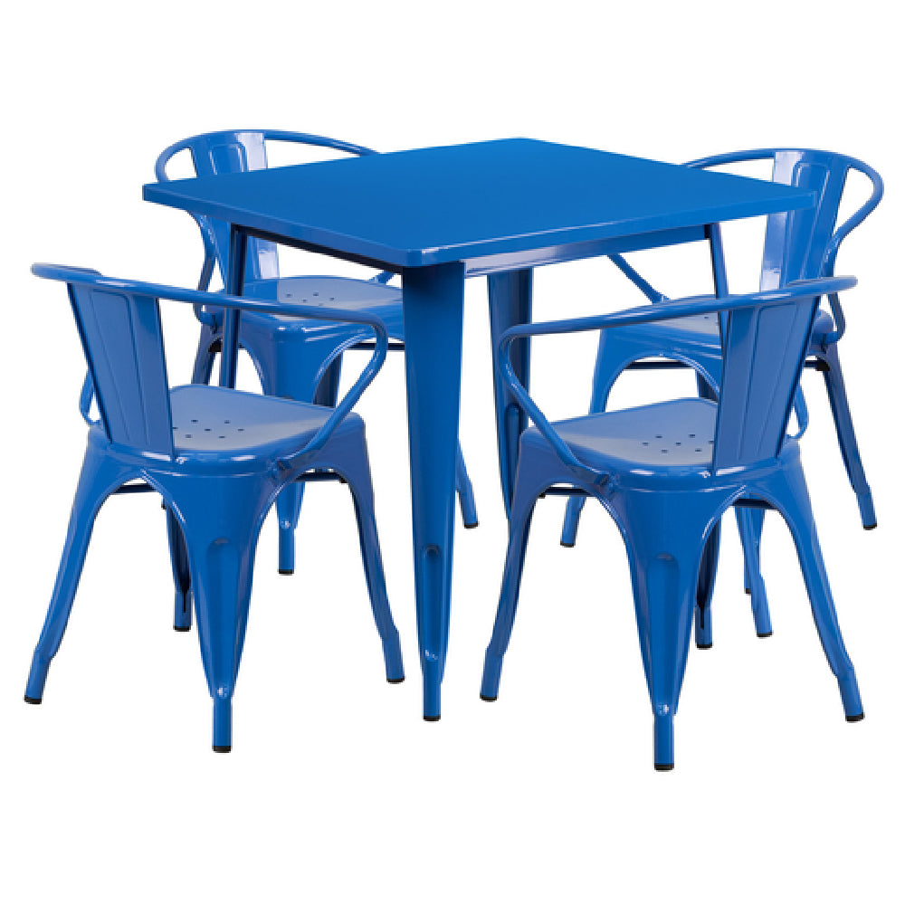 The Flash Furniture ET-CT002-4-70-BL-GG Table And Chair Set is a versatile and functional furniture ensemble designed for both commercial and residential environments. This set includes a square table measuring 31-1/2"W x 31-1/2"D x 29-1/2"H, featuring a smooth top with a 1" thick edge and a brace underneath for added stability. Accompanying the table are four chairs, each with dimensions of 21-1/2"W x 19"D x 27-3/4"H. The chairs are designed with a curved back and a vertical slat, integrated arms, and seat drain holes, ensuring comfort and practicality. Constructed from galvanized steel, the entire set boasts a durable powder coat finish in blue, making it suitable for indoor and outdoor use. The cross brace under the seat and rubber floor glides enhance stability and protect flooring surfaces. The set is shipped in two boxes and requires assembly, with in-stock items typically shipping within 24 hours. This Flash Furniture set caters to various market segments by providing a blend of aesthetic appeal, durability, and functionality, making it an excellent choice for cafes, restaurants, patios, and home dining areas. Its robust construction ensures longevity, while the modern design seamlessly complements diverse décor styles.