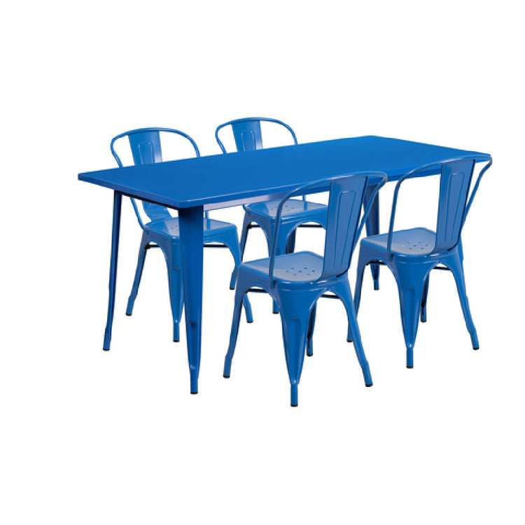 Flash Furniture ET-CT005-4-30-BL-GG Table And Chair Set is a versatile furniture ensemble designed for both indoor and outdoor applications, catering to commercial and residential environments. This set includes a rectangular table measuring 63 inches in width, 31-1/2 inches in depth, and 29-1/2 inches in height, featuring a smooth top with a robust 1-inch thick edge and a supportive brace underneath for enhanced durability. Complementing the table are four chairs, each designed with a curved back and vertical slat, along with drain holes in the seat to facilitate outdoor use. The chairs are reinforced with a cross brace under the seat, ensuring stability and strength. Constructed from galvanized steel with a powder coat finish, this set is built to withstand diverse conditions while maintaining an appealing aesthetic. Each chair is equipped with rubber floor glides to protect floors from scratches. The set is shipped in two boxes with assembly required, and typically dispatches within 24 hours for in-stock items. Available in a vibrant blue color, this table and chair set offers a blend of practicality and style, making it a valuable addition to any dining or meeting space.