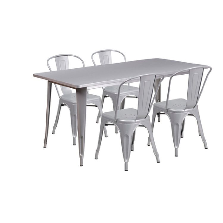 The Flash Furniture ET-CT005-4-30-SIL-GG Table and Chair Set is a versatile solution designed for both indoor and outdoor commercial and residential use. This set includes a rectangular table measuring 63 inches in width, 31-1/2 inches in depth, and 29-1/2 inches in height, featuring a smooth top with a 1-inch thick edge and a brace underneath for enhanced stability. Accompanying the table are four chairs, each built with a curved back and vertical slat design, ensuring comfort and ergonomic support. The chairs are equipped with drain holes in the seat for easy maintenance and a cross brace under the seat for added durability. Crafted from galvanized steel with a powder coat finish, the set boasts a robust construction that resists rust and corrosion, extending its lifespan in varying environments. Additionally, rubber floor glides protect surfaces from scratches, making this set adaptable for different flooring types. This product ships in two boxes and assembled parts may require some setup. In-stock items are typically dispatched within 24 hours, ensuring a quick and efficient delivery process. This table and chair set provides a practical and stylish seating arrangement, ideal for cafes, patios, dining rooms, and shared community spaces.