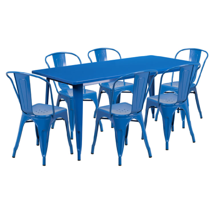 The Flash Furniture ET-CT005-6-30-BL-GG Table and Chair Set is a versatile furniture solution designed for both commercial and residential environments. This set includes a rectangular table measuring 63 inches in width, 31-1/2 inches in depth, and 29-1/2 inches in height, featuring a smooth top with a 1-inch thick edge and a supportive brace underneath for enhanced durability. Accompanied by six chairs, each 18 inches wide, 20 inches deep, and 33 inches high, this set provides ample seating with a curved back design and vertical slats for added comfort and style. The chairs include drain holes in the seat, making them suitable for indoor and outdoor use. Constructed from galvanized steel with a powder-coated finish, the set is built to withstand various environmental conditions, while rubber floor glides on the chairs protect flooring surfaces. Shipped in two boxes and requiring assembly, the Flash Furniture ET-CT005-6-30-BL-GG set is an ideal option for dynamic settings, offering flexibility and durability in a vibrant blue color. The set is readily available, with in-stock items typically shipping within 24 hours, meeting the demands of efficient service and convenience.