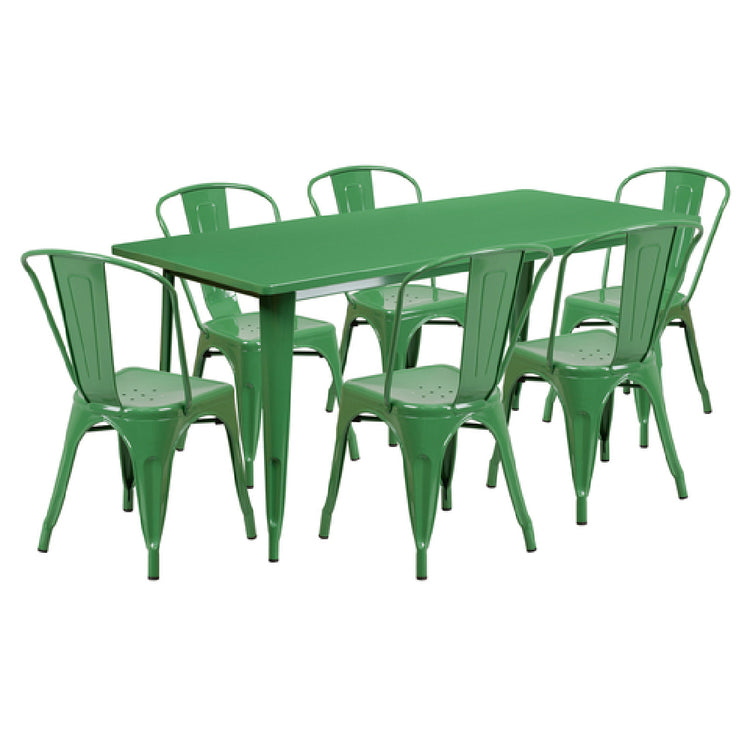 The Flash Furniture ET-CT005-6-30-GN-GG Table and Chair Set, meticulously designed for both commercial and residential applications, features a spacious rectangular table measuring 63 inches in width, 31-1/2 inches in depth, and 29-1/2 inches in height. The table's construction includes a smooth top with a 1-inch thick edge and a supportive brace underneath, ensuring durability and stability. This set is complemented by six chairs, each with dimensions of 18 inches in width, 20 inches in depth, and 33 inches in height. The chairs boast a curved back with vertical slats and strategically placed drain holes in the seat, enhancing comfort and practicality. Constructed from galvanized steel and finished with a powder coat, the set is optimized for long-lasting use in both indoor and outdoor settings. Added features like cross braces and rubber floor glides provide additional support and protection for flooring surfaces. Available in a vibrant green color, the set requires assembly and is conveniently shipped in two boxes, with in-stock items typically dispatched within 24 hours. This versatile furniture solution is ideal for various market segments looking for durable, stylish, and functional seating arrangements.