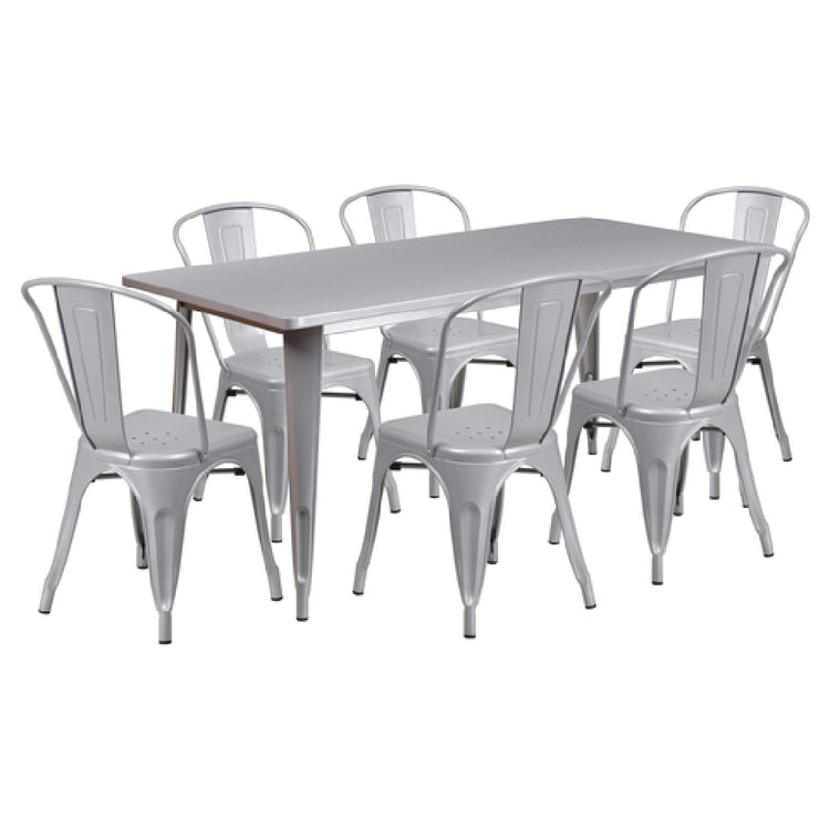 The Flash Furniture ET-CT005-6-30-SIL-GG Table and Chair Set is a versatile and functional addition for both commercial and residential settings. This set includes a rectangular table measuring 63 inches wide, 31-1/2 inches deep, and 29-1/2 inches high, featuring a smooth top with a 1-inch thick edge and a sturdy brace underneath for enhanced stability. Accompanying the table are six chairs, each 18 inches wide, 20 inches deep, and 33 inches high, designed with a curved back and vertical slat for ergonomic support. The chairs also feature drain holes in the seat for easy maintenance and a cross brace for added durability. Constructed from galvanized steel with a powder coat finish, this furniture set is designed for indoor and outdoor use, offering resilience against various elements. The inclusion of rubber floor glides ensures floors remain scratch-free, making this set suitable for diverse environments, from bustling cafes to intimate home dining areas. Shipped in two boxes for convenience, the ET-CT005-6-30-SIL-GG set typically ships within 24 hours, promising fast delivery. This product requires assembly, catering to those who appreciate hands-on involvement in setting up their space.
