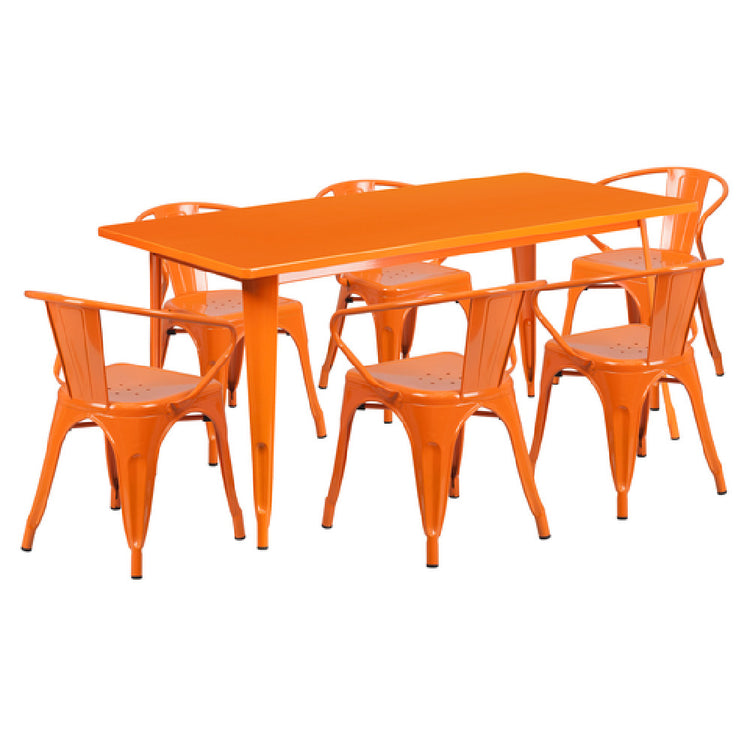 The Flash Furniture ET-CT005-6-70-OR-GG Table and Chair Set is a versatile option for both commercial and residential settings, offering a balance of style and practicality. The set includes a rectangular table measuring 63"W x 31-1/2"D x 29-1/2"H, featuring a smooth top with a 1" thick edge and a brace underneath for added stability. Accompanying the table are six chairs, each with dimensions of 21-1/2"W x 19"D x 27-3/4"H, designed with a curved back and vertical slat for ergonomic support. The chairs also feature integrated arms and drain holes in the seat, enhancing comfort and functionality. Constructed from galvanized steel, both the table and chairs boast a durable powder coat finish in a vibrant orange color, suitable for indoor and outdoor use. The inclusion of rubber floor glides ensures protection for your flooring surfaces. This set is shipped in two boxes and requires assembly, typically dispatching within 24 hours for in-stock items. The Flash Furniture ET-CT005-6-70-OR-GG set is ideal for a variety of environments, providing a reliable and aesthetically pleasing seating solution.