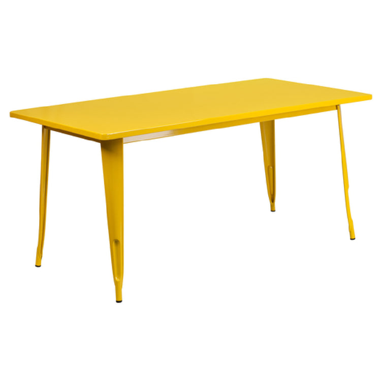 The Flash Furniture ET-CT005-YL-GG Table - 63"W x 31-1/2"D x 29-1/2"H is a versatile dining height table designed to cater to both commercial and residential markets. Its rectangular design, coupled with a smooth top and a 1-inch thick edge, provides a clean and modern aesthetic suitable for various settings. The table is constructed from galvanized steel, ensuring durability and longevity, while its powder coat finish adds an extra layer of protection against the elements, making it ideal for indoor and outdoor use. An underside brace enhances stability and support, a crucial feature for high-traffic environments. The inclusion of rubber floor glides helps protect flooring surfaces from scratches, ensuring that the table can be moved effortlessly without causing damage. Available in an eye-catching yellow, this table adds a pop of color to any space. Additionally, it requires assembly and is typically ready for shipment within 24 hours, making it a convenient choice for businesses or homeowners looking for immediate solutions. This product's robust construction and thoughtful design make it an excellent choice for settings ranging from bustling cafes to serene gardens.