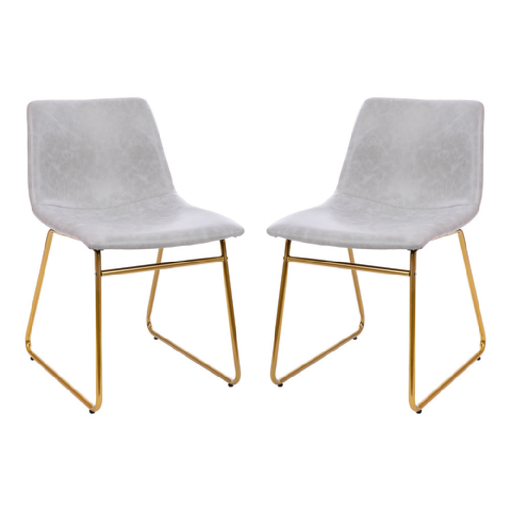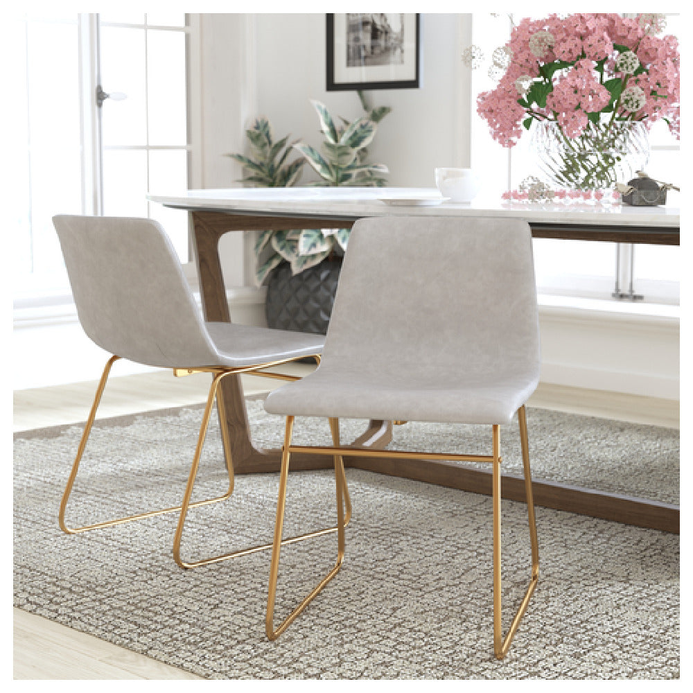 The Flash Furniture ET-ER18345-18-LG-GG Dining Chair features a robust design, accommodating up to 250 lb. weight capacity, making it suitable for diverse environments from dining rooms to commercial spaces. This chair is characterized by its mid-back sled base, which provides stability and a sleek aesthetic, ideal for modern interior settings. The inclusion of adjustable floor glides ensures that the chair can be leveled on uneven surfaces, enhancing usability across different flooring types. Crafted with LeatherSoft material, the light gray seat offers a comfortable and premium seating experience, blending durability with a soft finish. The chair's elegant gold frame adds a touch of luxury and sophistication, making it a stylish addition to any space. Sold as a set of 2, these chairs are perfect for creating a cohesive look in dining areas, cafes, and meeting rooms. The thoughtful design and quality materials of the Flash Furniture ET-ER18345-18-LG-GG Dining Chair make it a versatile choice for anyone seeking a combination of comfort, style, and functionality in their seating solutions.