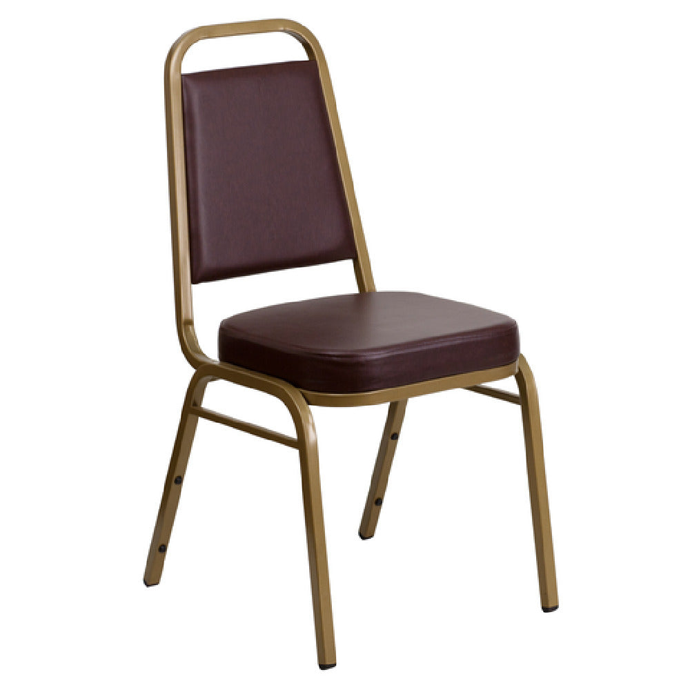 The Flash Furniture FD-BHF-1-ALLGOLD-BN-GG Hercules Series Stacking Banquet Chair is engineered to meet the demanding needs of commercial environments with its impressive 500 lb weight capacity. This chair features a trapezoidal seamless back panel that merges style with comfort, and a vinyl upholstered seat and back, offering a professional aesthetic and easy maintenance. The seat is constructed with a 2-1/2" thick CA117 fire retardant foam to ensure both safety and comfort. Structural integrity is enhanced with double support braces and a sturdy 16 gauge steel frame, finished with a gold powder coating that provides an elegant appearance and added durability. Plastic bumper guards protect the frame from damage during stacking, allowing these chairs to be stacked up to 13 high for efficient storage. Plastic floor glides are integrated to prevent floor damage during movement, making it a practical choice for venues such as conference centers, hotels, and event halls. This chair ships fully assembled, ready for immediate use, and is typically dispatched within 24 hours for in-stock items, ensuring swift delivery to meet the needs of busy venues and operators who require reliable and high-capacity seating solutions.