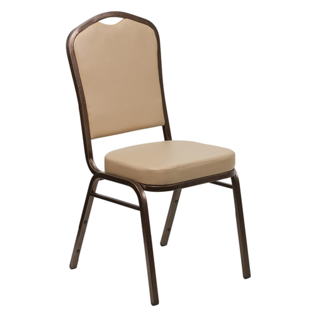 The Flash Furniture FD-C01-COPPER-TN-VY-GG Hercules Series Stacking Banquet Chair is engineered to cater to diverse seating needs, from commercial spaces to event venues. With a remarkable weight capacity of 500 lbs, this chair is a testament to robust construction and durability. The chair features a crown design seamless back panel, enhancing both elegance and comfort. The vinyl upholstered seat and back, paired with a 2-1/2" thick CA117 fire retardant foam seat, assure not only comfort but also safety. Reinforced with double support braces, this chair is built to withstand the rigors of frequent use. Its 16-gauge steel frame, finished with a copper vein powder coating, adds a touch of sophistication while ensuring structural integrity. The inclusion of plastic bumper guards and floor glides make it floor-friendly, minimizing scuffs and scratches during use. Designed for commercial applications, it stacks up to 14 chairs high, optimizing storage space efficiently. This chair is shipped fully assembled, saving time and effort for users. Whether used in banquet halls, conference centers, or hospitality settings, the Flash Furniture Hercules Series Banquet Chair stands out for its blend of functionality, safety, and aesthetic appeal.