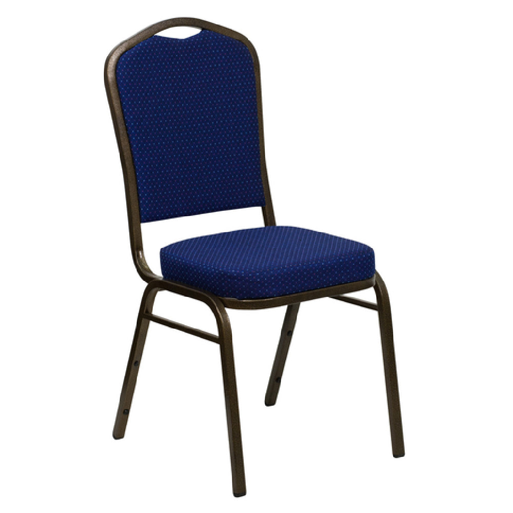 The Flash Furniture FD-C01-GOLDVEIN-208-GG Hercules Series Stacking Banquet Chair is a robust seating solution designed to accommodate up to 500 lb, making it suitable for diverse commercial settings. This chair features a crown design seamless back panel and a diamond-patterned fabric that upholsters both the seat and back, offering a sophisticated appearance. It is equipped with a 2-1/2" thick CA117 fire retardant foam seat, ensuring safety and comfort. The chair's durability is enhanced by its 16 gauge steel frame and double support braces, providing long-lasting stability. The gold vein powder-coated frame finish adds to its aesthetic appeal and resistance to wear. Practical features include plastic bumper guards that prevent damage during stacking and plastic floor glides that protect flooring surfaces. Designed for efficient space utilization, this chair can be stacked up to 14 chairs high. Available in navy blue, it arrives fully assembled and is typically shipped within 24 hours for in-stock items. This banquet chair is an ideal choice for event venues, hotels, and conference centers, offering a combination of strength, style, and functionality.