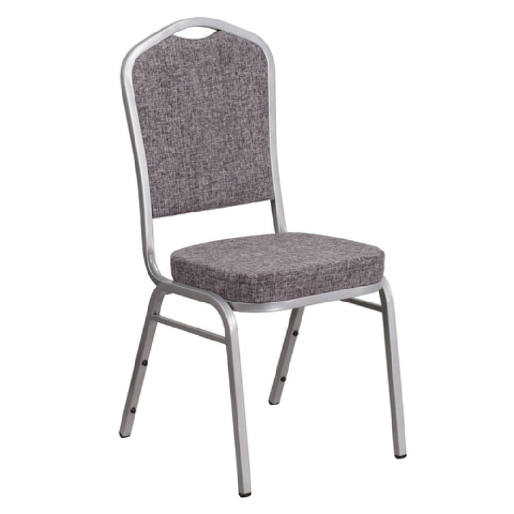 The Flash Furniture FD-C01-S-12-GG Hercules Series Stacking Banquet Chair is a robust seating solution with a 500 lb. weight capacity, designed to meet the demands of commercial settings. This chair features a crown design seamless back panel, providing an elegant aesthetic, while the herringbone fabric upholstered seat and back offer comfort and style. It includes a 2-1/2" thick CA117 fire retardant foam seat for added safety. Built with durability in mind, it boasts a 16 gauge steel frame, finished in a silver powder coat that enhances its resilience and appearance. Double support braces add structural integrity, while plastic bumper guards protect the chair during stacking and storage. The inclusion of plastic floor glides ensures easy movement and protects flooring surfaces. This chair can be conveniently stacked up to 14 chairs high, optimizing space when not in use. Available in gray, it ships fully assembled, and in-stock items typically ship within 24 hours. Ideal for banquet halls, conference centers, and other venues requiring flexible seating arrangements, this chair combines functionality with a sleek design, making it a valuable asset for various industries.
