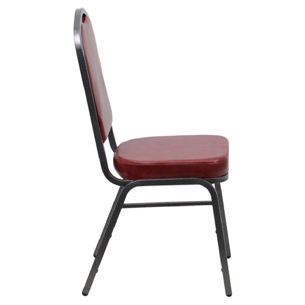 The Flash Furniture FD-C01-SILVERVEIN-BURG-VY-GG Hercules Series Stacking Banquet Chair is engineered for robustness and utility in various settings, boasting a 500 lb. weight capacity that ensures durability for high-traffic environments. Its crown design seamless back panel delivers both style and support, while the vinyl upholstered seat and back provide comfort and easy maintenance. The seat features a 2-1/2" thick CA117 fire retardant foam, prioritizing safety in compliance with fire safety standards. Structurally, the chair is supported by double support braces and a 16-gauge steel frame, ensuring stability and longevity. The silver vein powder-coated frame finish adds a sleek aesthetic as well as resistance to wear and tear. For enhanced practicality, plastic bumper guards and plastic floor glides are included, protecting both the chair and the flooring during use and storage. Uniquely designed for commercial use, this chair is capable of stacking up to 14 chairs high, optimizing space efficiency in banquet halls, conference centers, and hospitality venues. Available in burgundy, this chair is shipped fully assembled, with in-stock items typically dispatched within 24 hours, making it a reliable and convenient choice for businesses looking to enhance their seating solutions swiftly.