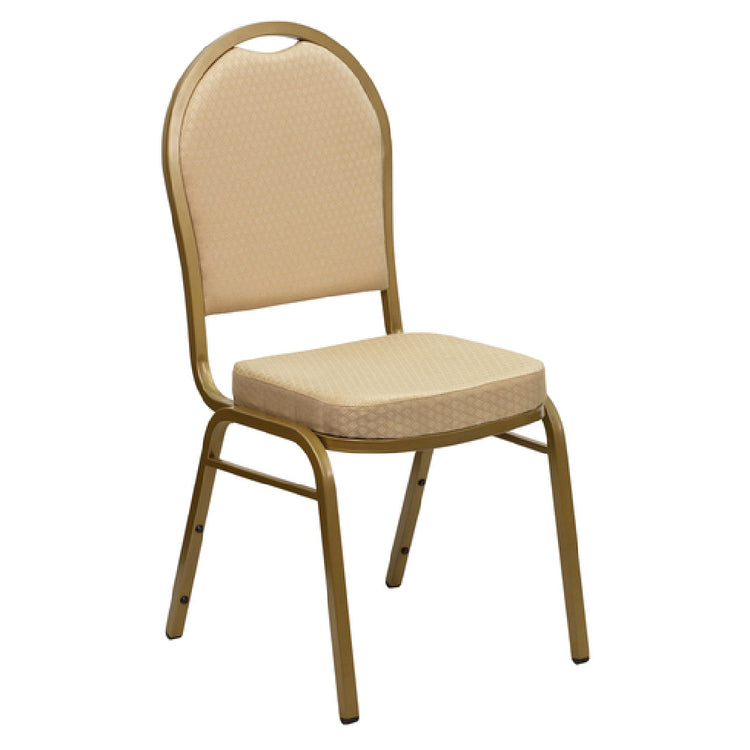 The Flash Furniture FD-C03-ALLGOLD-H20124E-GG Hercules Series Stacking Banquet Chair is a versatile seating solution designed for commercial environments, offering a substantial weight capacity of 500 lbs. Its elegant dome design features a seamless back panel, while the seat and back are upholstered in patterned fabric for added comfort and style. This chair is equipped with a 2-1/2" thick CA117 fire retardant foam seat, enhancing safety and comfort. Built with durability in mind, it includes double support braces and a 16-gauge steel frame, finished with a gold powder coating for an attractive and robust appearance. The chair is designed with practical plastic bumper guards and plastic floor glides to protect surfaces and ensure easy movement. One of its key features is its ability to stack up to 14 chairs high, making it an excellent space-saving option for banquet halls, conference centers, and hospitality venues. It ships fully assembled, ready for immediate use, and is typically dispatched within 24 hours, ensuring quick turnaround for urgent needs. Whether catering to large events or small gatherings, this chair combines functionality and aesthetics, making it a reliable choice for various segment markets within the industry.