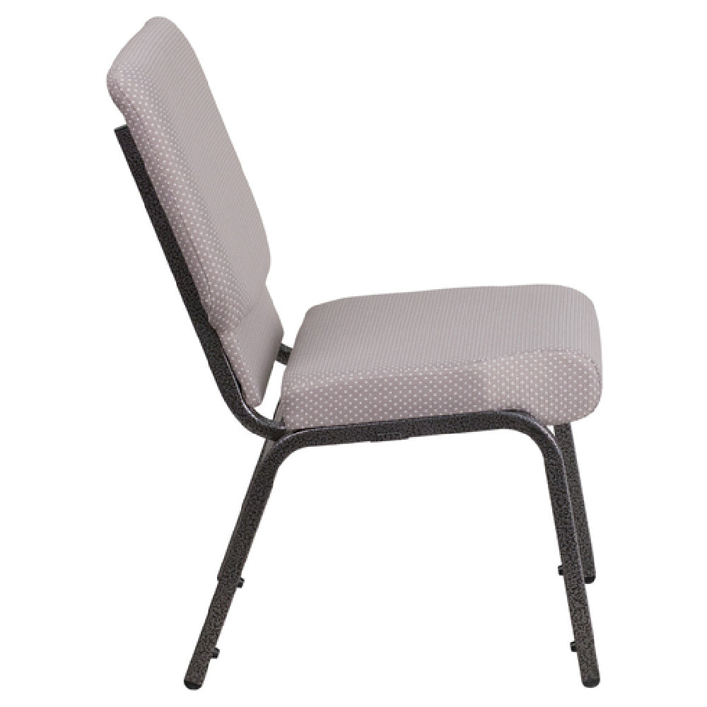 The Flash Furniture FD-CH02185-SV-GYDOT-GG Hercules Series Stacking Church Chair is an exceptionally durable seating solution with an impressive weight capacity of 800 lb, catering to a wide range of community and religious gatherings. It features a comfortable 4-1/4" thick waterfall edge seat, designed with a dot patterned cotton upholstery that adds a touch of elegance and style. The chair is constructed with a 16-gauge steel frame that ensures long-lasting strength and stability, complemented by a silver vein frame finish for added visual appeal. Safety is a priority, as the chair includes CA117 fire retardant foam, making it suitable for public spaces. Practicality is enhanced with a book pouch on the back, providing convenient storage for hymnals or personal belongings. The chair's design includes ganging brackets, enabling easy connection of multiple chairs for organized seating arrangements. Plastic rocker glides are incorporated to protect flooring surfaces and facilitate smooth movement. Although assembly is required, the chair's components are designed for straightforward construction. This product is typically in stock and ships within 24 hours, making it a reliable choice for settings that demand both functionality and fast availability.