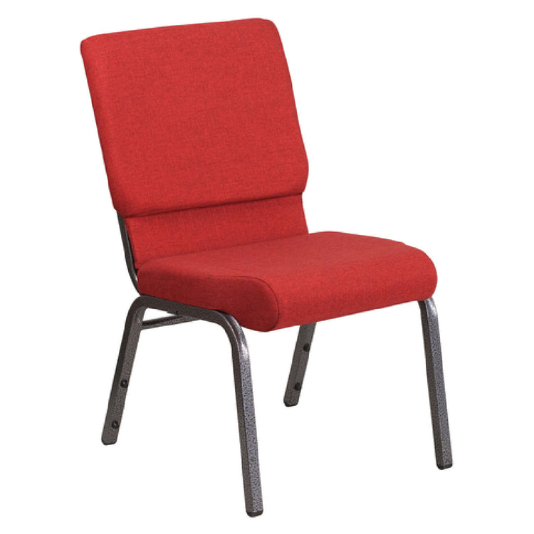The Flash Furniture FD-CH02185-SV-RED-GG Hercules Series Stacking Church Chair is engineered with a remarkable weight capacity of 800 lb., making it a versatile seating solution for diverse environments like worship spaces, conference halls, and community centers. This chair features a plush 4-1/4" thick waterfall edge seat, upholstered in comfortable cotton, enhancing both support and aesthetics. Safety and durability are paramount, evidenced by the CA117 fire retardant foam used in its construction. The chair is supported by a robust 16 gauge steel frame, finished with a stylish silver vein, ensuring longevity and stability. A practical book pouch on the back offers convenient storage, while ganging brackets provide the option to connect multiple chairs seamlessly, facilitating space-efficient arrangements. Plastic rocker glides protect flooring surfaces, enhancing mobility and ease of use. The chair's striking red color adds a vibrant touch to any setting. With assembly required, this chair is typically ready to ship within 24 hours from stock, offering a quick and reliable seating solution. The Flash Furniture Hercules Series is an exemplary combination of comfort, functionality, and durability, catering to the specific needs of various segment markets within its industry.