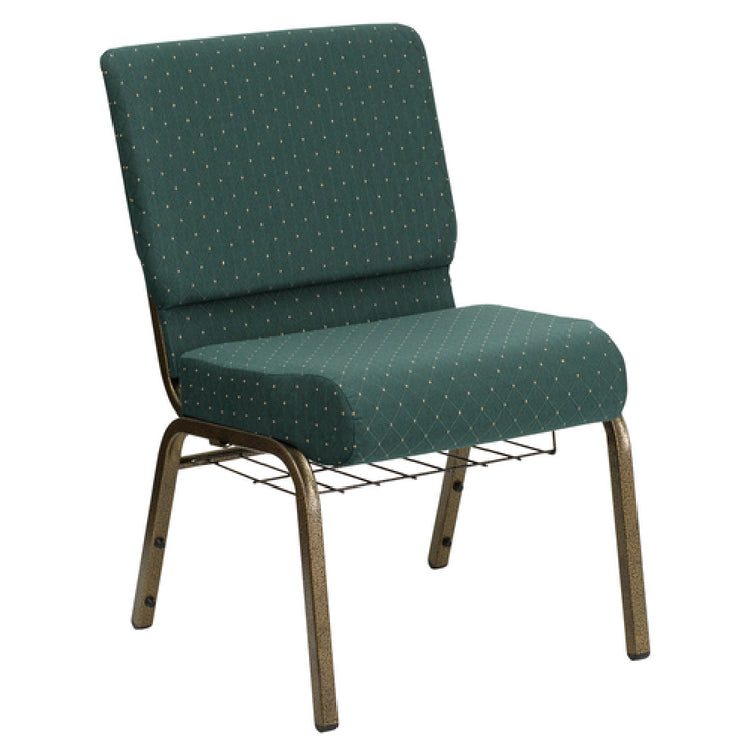 The Flash Furniture FD-CH0221-4-GV-S0808-BAS-GG Hercules Series Extra Wide Stacking Church Chair is a robust seating solution designed to accommodate a variety of settings. With an impressive weight capacity of 800 lb., this chair offers exceptional durability, making it suitable for various user needs. The chair features a dot-patterned fabric upholstery that adds a touch of elegance while ensuring long-lasting wear. Comfort is prioritized with a 4-inch thick seat and a 5-inch thick waterfall edge, designed to reduce pressure on the legs. Safety standards are met with CA117 fire retardant foam, providing peace of mind in public spaces. A practical book pouch on the back of the chair offers convenient storage, complemented by a steel book rack with a communion cup holder for organized functionality in religious settings. Constructed with a 16-gauge steel frame, the chair boasts a gold vein finish that enhances its visual appeal. Ganging brackets allow for easy arrangement and connectivity, while plastic rocker glides ensure stability and protect floors. Available in a hunter green color, this chair requires assembly. In-stock items are typically shipped within 24 hours, ensuring prompt delivery for immediate use. This chair is ideal for churches, conference rooms, and other communal environments requiring reliable and comfortable seating.