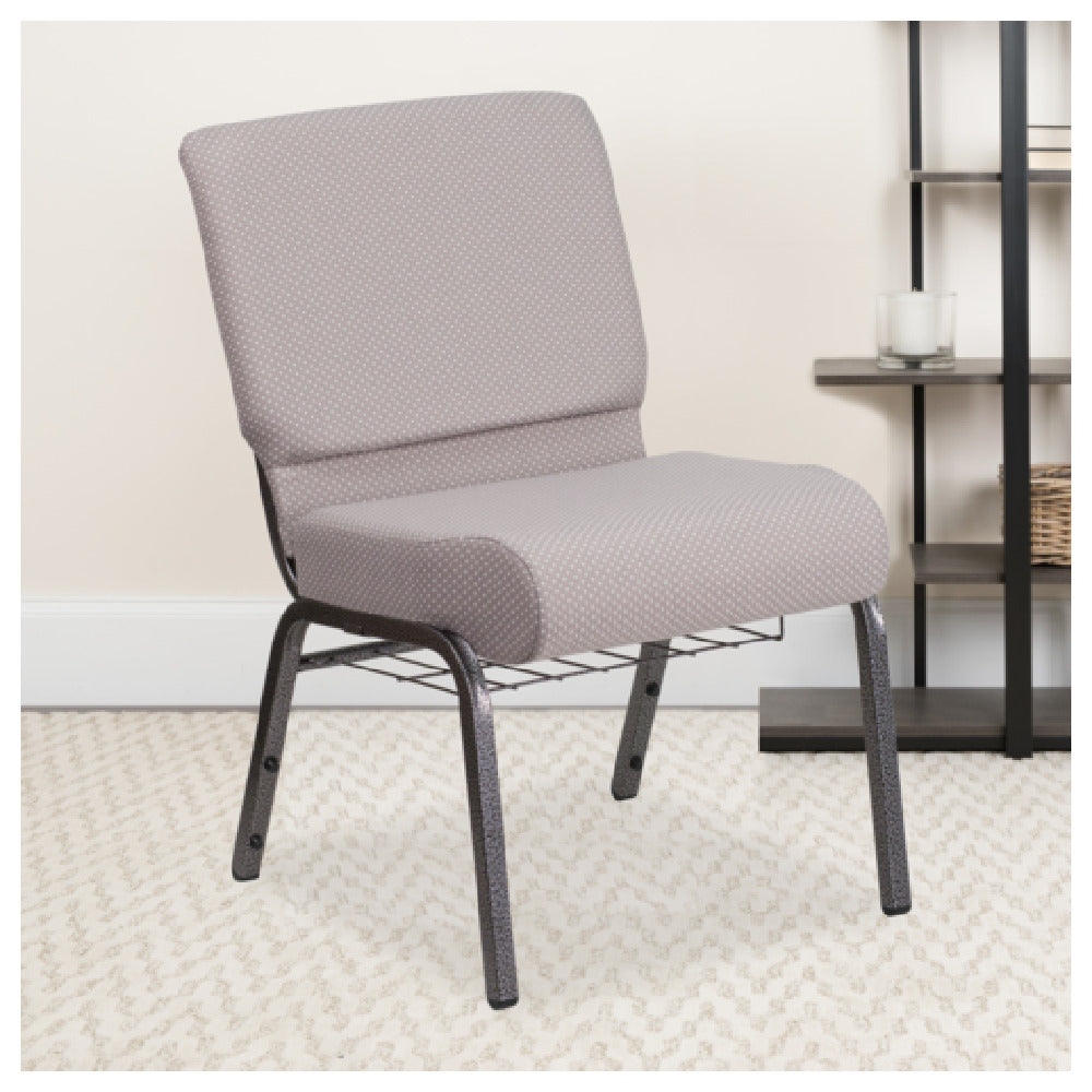 The Flash Furniture FD-CH0221-4-SV-GYDOT-BAS-GG Hercules Series Extra Wide Stacking Church Chair is a versatile seating solution designed to meet the demands of various environments, including religious, community, and event spaces. This chair boasts an impressive 800 lb. weight capacity, ensuring durability and stability for a broad range of users. Upholstered in a stylish dot patterned fabric, it combines aesthetic appeal with comfort provided by a generously cushioned 4-inch thick seat featuring a 5-inch thick waterfall edge. The chair's safety features include CA117 fire retardant foam, enhancing its suitability for public settings. Built with a rugged 16-gauge steel frame, it promises long-term reliability, while the silver vein frame finish adds a touch of elegance. Practical additions such as an underseat book rack offer convenient storage, and the inclusion of ganging brackets allows for effortless row setup. Equipped with plastic rocker glides, this chair ensures smooth movement and floor protection. While assembly is required, the chair typically ships within 24 hours when in stock, making it a timely investment for your space. This product uniquely caters to different market segments by combining robust construction with practical features, making it a valuable addition to any venue requiring high-capacity seating.