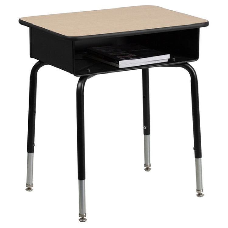 The Flash Furniture FD-DESK-GG Student Desk is a highly adaptable workspace solution designed to meet the needs of students across a range of educational levels, from elementary to high school. Featuring a 24"W x 18"D work surface, the desk provides ample space for studying or completing assignments. The 5/8" thick high-pressure laminate top is finished in a natural laminate, complemented by a black lacquer edge treatment for enhanced durability and aesthetics. One of its standout features is the adjustable height mechanism, which ranges from 22-1/4" to 31-1/4", accommodating users of various heights and ensuring ergonomic comfort. This desk includes a 20-1/2"W x 15"D x 5-1/4"H black open front metal book box, offering convenient storage for books and supplies. Its black upper frame finish contrasts elegantly with the silver powder-coated lower legs, all supported by a robust steel tubular criss-cross frame for stability. Equipped with adjustable nylon glides, the desk ensures stability on uneven surfaces. With these features, the Flash Furniture FD-DESK-GG Student Desk is an excellent choice for educational institutions looking for functional, durable, and adaptable classroom furniture. Assembly is required, and items typically ship within 24 hours when in stock, making it a practical choice for timely setups.
