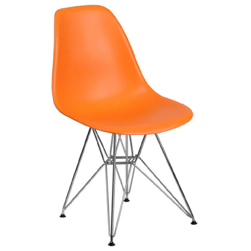 The Flash Furniture FH-130-CPP1-OR-GG Elon Series Accent Side Chair - contoured design is an exemplary seating solution for both commercial and style-conscious environments. Designed with a polypropylene molded back and seat, this chair offers a sleek and modern look while ensuring durability and comfort. The contoured design provides ergonomic support, complemented by the waterfall seat that promotes better circulation. The chrome base not only adds a touch of elegance but also ensures stability, reinforced with bracing for added durability. The chair is equipped with adjustable floor glides, making it adaptable to various surfaces and settings, an essential feature for commercial use. Available in a vibrant orange plastic, it adds a pop of color and modern flair to any space. In stock items usually ship within 24 hours, making it a reliable choice for businesses needing quick and efficient solutions. This chair’s unique combination of style, functionality, and durability makes it suitable for various market segments, including hospitality, office, and retail environments, where both aesthetics and practicality are paramount.