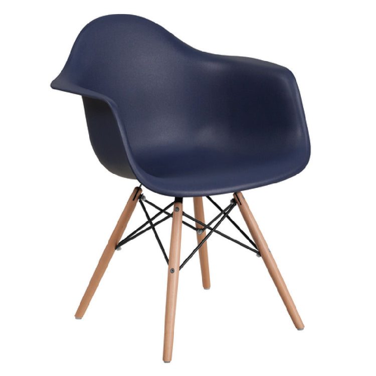 The Flash Furniture FH-132-DPP-NY-GG Alonza Series Armchair is a sophisticated seating solution designed for both commercial and personal environments. This armchair features a distinctive contour design that enhances ergonomic comfort and provides a visually appealing silhouette. The waterfall seat design promotes better circulation and reduces pressure on the thighs, making it ideal for long periods of seating in office spaces, conference rooms, or reception areas. Constructed with durable polypropylene, this chair is built to withstand the rigors of daily use while maintaining a sleek, modern aesthetic. The curved arms offer additional support and comfort, contributing to the chair's overall ergonomic design. The sturdy wood base is reinforced with metal bracing, ensuring stability and durability, while the adjustable floor glides allow for easy adaptation to uneven surfaces, safeguarding floors from scratches. Available in an elegant navy color, the Alonza Series Armchair complements a variety of interior décors. With a commitment to quality and functionality, this chair is typically shipped within 24 hours, adding convenience for businesses that require prompt furnishing solutions. Whether utilized in a high-traffic commercial setting or a stylish home office, this armchair combines form and function to deliver an exceptional seating experience.