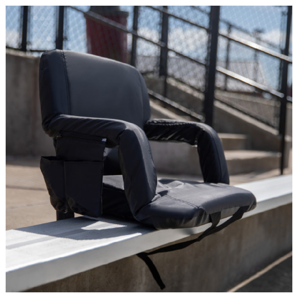 The Flash Furniture FV-FA090-BK-GG Stadium Bleacher Chair is a versatile seating solution with a 265 lb. weight capacity, ideal for a variety of outdoor events and sporting activities. This portable chair is distinguished by its black poly fabric construction and sturdy metal frame, ensuring durability and comfort. The chair features a padded back and seat, providing enhanced comfort for extended periods of sitting. With six reclining positions, users can adjust the chair to their preferred seating angle, making it suitable for different viewing experiences. Additionally, the chair can be used with or without armrests, adding to its adaptability for user preferences. For ease of transport, the chair is equipped with adjustable backpack straps, allowing users to carry it conveniently. The dual side pockets, along with a rear zippered storage compartment and an elastic arm pouch, offer ample storage options for personal items and accessories. This chair does not require assembly, making it a hassle-free addition to any event. The Flash Furniture FV-FA090-BK-GG Stadium Bleacher Chair is designed to meet the needs of sports enthusiasts, concert-goers, and anyone looking for a comfortable and portable seating option.