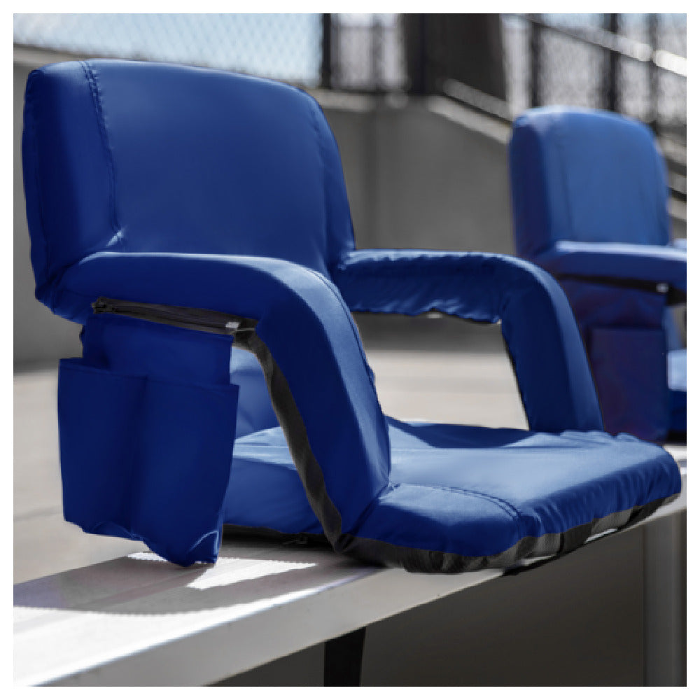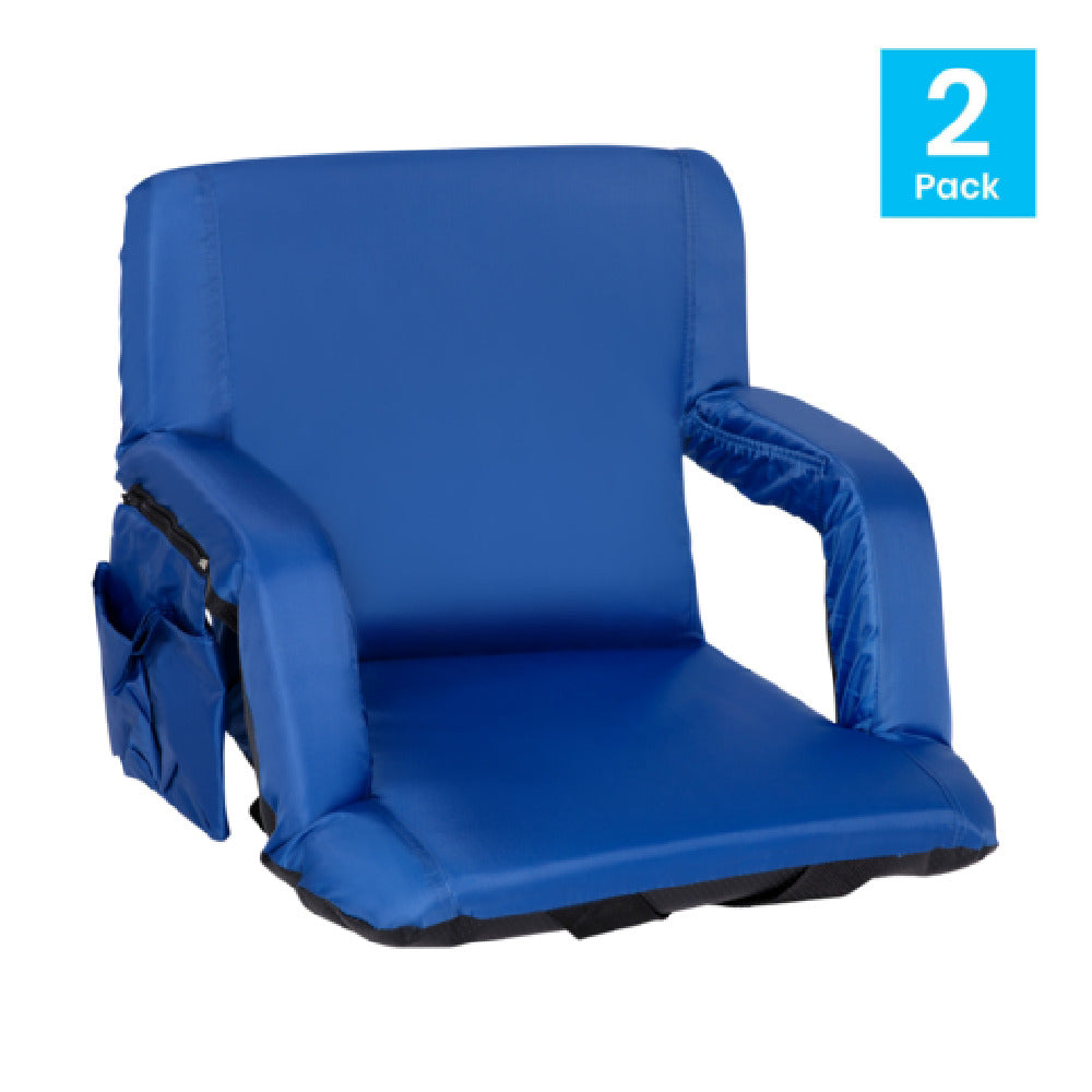 The Flash Furniture FV-FA090-BL-2-GG Stadium Bleacher Chair is a versatile seating solution designed to enhance comfort and portability for sports enthusiasts and event attendees. With a weight capacity of 265 lbs, this chair is built with a durable metal frame and features a padded back and seat, ensuring long-lasting comfort during extended use. The chair offers six reclining positions, allowing users to customize their seating angle for optimal relaxation. It can be used with or without armrests, catering to individual preferences. The poly fabric material is both resilient and easy to maintain, making it suitable for various outdoor environments. For added convenience, the chair is equipped with dual side pockets and a rear zippered storage compartment, providing ample space for personal belongings. An elastic arm pouch adds to its practicality by offering quick access to small items. The chair is designed with adjustable backpack straps, enabling easy transport to and from venues. Available in a striking blue color, this set of two chairs requires no assembly, making it an ideal choice for those seeking a blend of comfort, functionality, and ease of use in a stadium setting.